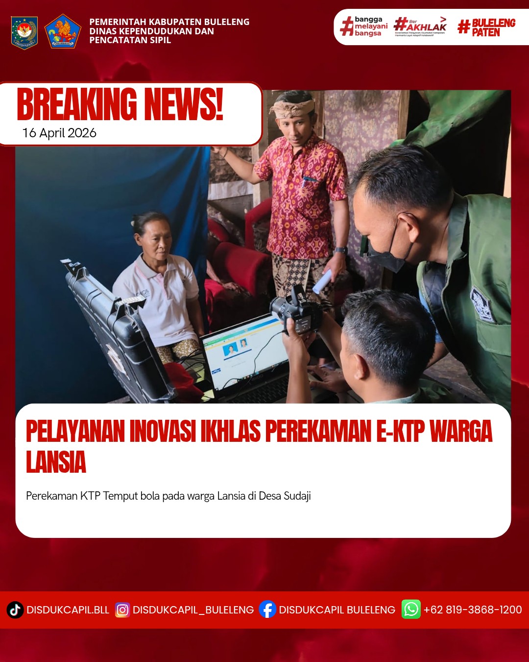 Pada hari ini Kamis, 16 April 2026 Dinas Kependudukan dan Pencatatan Sipil Kabupaten Buleleng melaksanakan penerapan Inovasi Ikhlas dengan melakukan jemput bola kepada masyarakat untuk melakukan perekaman KTP-El kepada warga Lansia di Desa Sudaji atas nama :