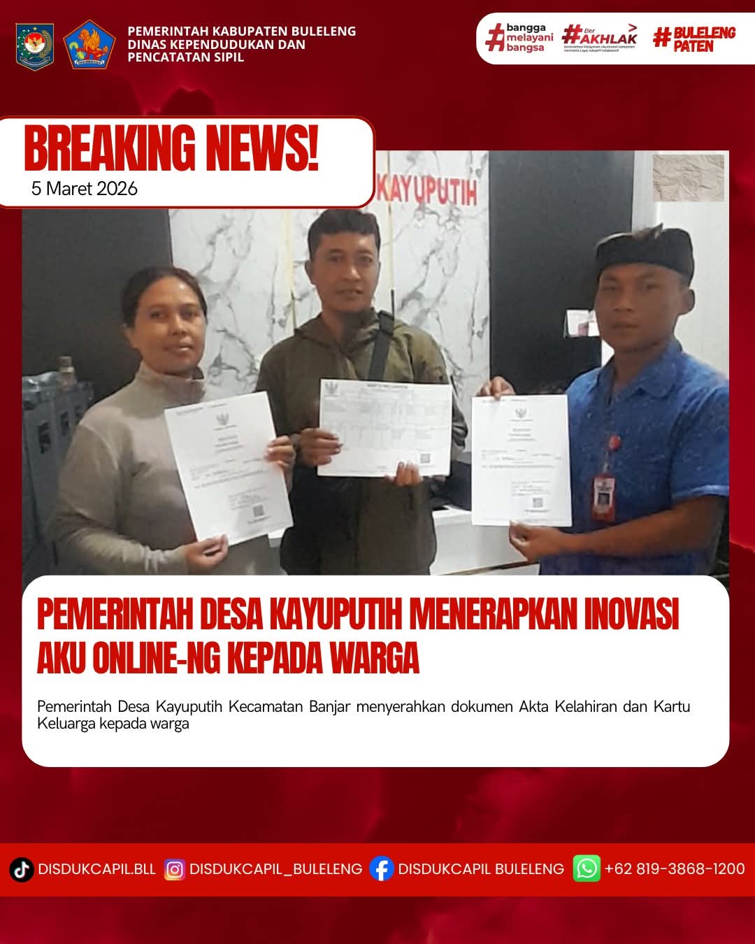 Pemerintah Kabupaten Buleleng melalui Dinas Kependudukan dan Pecatatan Sipil (Disdukcapil) Kabupaten Buleleng memaksimalkan serta mempermudah pelayanan kependudukan masyarakat dengan beberapa inovasi, melalui aplikasi AKU Online-NG. Dimana dalam penerapan aplikasi Aku Online-NG tersebut masyarakat tidak perlu lagi datang ke Dinas Dukcapil untuk melakukan pelayanan langsung cukup dengan datang ke Desa nanti akan dibantu oleh operator Desa masing-masing. Di Desa Kayuputih Kecamatan Banjar, telah diserahkan dokumen kependudukan berupa Akta Kelahiran dan Kartu Keluarga atas nama Gede Subala warga Banjar Dinas Tabog Desa Kayuputih yang diserahkan secara langsung oleh Pemerintah Desa Kayuputih Kecamatan Banjar, Rabu (25/2).