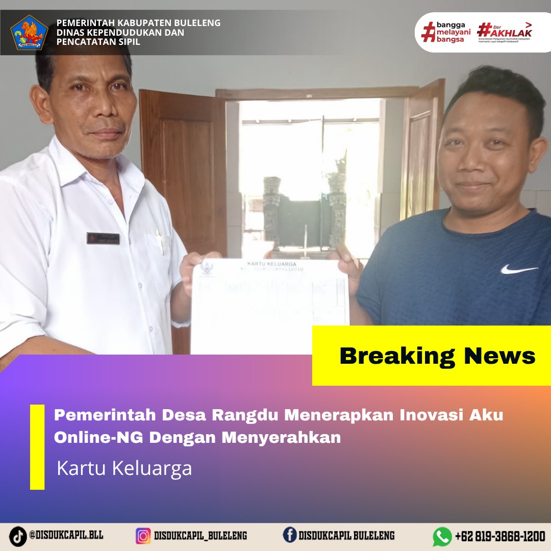 Pemerintah Kabupaten Buleleng melalui Dinas Kependudukan dan Pecatatan Sipil (Disdukcapil) Kabupaten Buleleng memaksimalkan serta mempermudah pelayanan kependudukan masyarakat dengan beberapa inovasi, melalui aplikasi AKU Online. Dimana dalam penerapan aplikasi Aku Online tersebut masyarakat tidak perlu lagi datang ke Dinas Dukcapil untuk melakukan pelayanan langsung cukup dengan datang ke Desa nanti akan dibantu oleh operator Desa masing-masing. Di Desa Rangdu Kecamatan Seririt telah diserahkan dokumen kependudukan berupa Kartu Keluarga karena hilang atas nama Ketut Bagiasa yang diserahkan oleh Kelian Banjar Dinas Karya Nadi Desa Rangdu Kecamatan Seririt, Rabu (15/10).