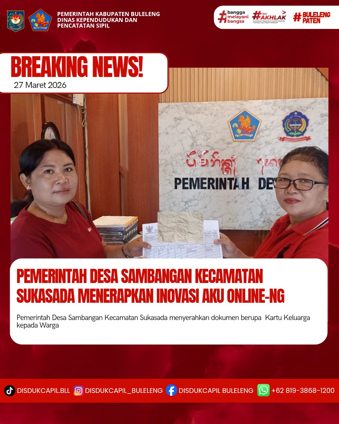 Pemerintah Kabupaten Buleleng melalui Dinas Kependudukan dan Pecatatan Sipil (Disdukcapil) Kabupaten Buleleng memaksimalkan serta mempermudah pelayanan kependudukan masyarakat dengan beberapa inovasi, melalui aplikasi AKU Online-NG. Dimana dalam penerapan aplikasi Aku Online-NG tersebut masyarakat tidak perlu lagi datang ke Dinas Dukcapil untuk melakukan pelayanan langsung, cukup dengan datang ke Desa nanti akan dibantu oleh operator Desa masing-masing. Di Desa Sambangan Kecamatan Sukasada, telah diserahkan dokumen kependudukan berupa Kartu Keluarga atas nama Made Maharba Wibawa warga BD. Sambangan diserahkan oleh Kasi Pemerintahan Desa Sambangan yang bertempat di Kantor Perbekel Desa Sambangan, Kecamatan Sukasada, Kabupaten Buleleng, Jumat (27/3).