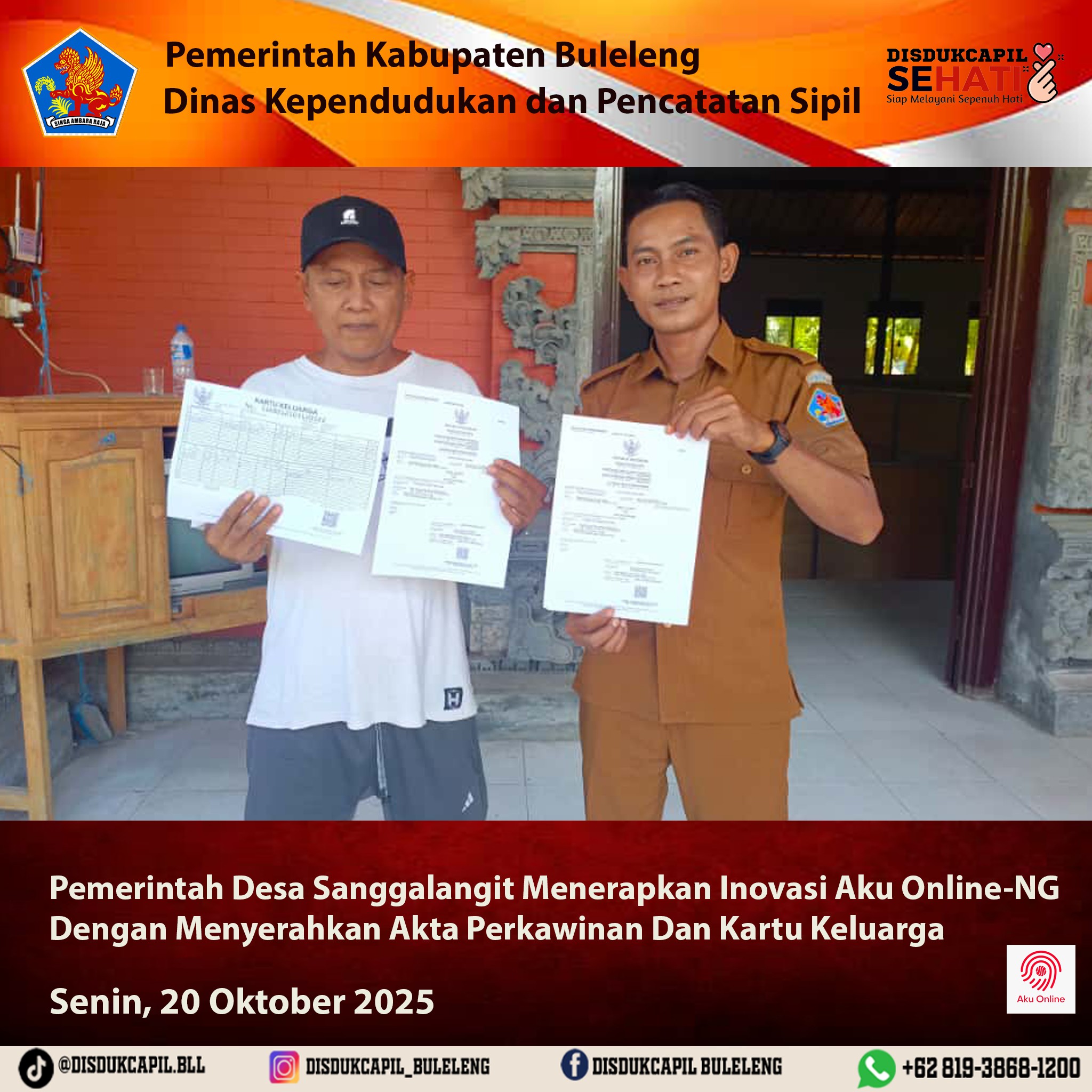 Pemerintah Kabupaten Buleleng melalui Dinas Kependudukan dan Pecatatan Sipil (Disdukcapil) Kabupaten Buleleng memaksimalkan serta mempermudah pelayanan kependudukan masyarakat dengan beberapa inovasi, melalui aplikasi AKU Online. Dimana dalam penerapan aplikasi Aku Online tersebut masyarakat tidak perlu lagi datang ke Dinas Dukcapil untuk melakukan pelayanan langsung cukup dengan datang ke Desa nanti akan dibantu oleh operator Desa masing-masing. Di Desa Sanggalangit Kecamatan Gerokgak telah diserahkan dokumen kependudukan berupa Akta Perkawinan dan Kartu Keluarga kepada warga Banjar Dinas Wanasari atas nama Gede Juliana yang diserahkan oleh Kelian Banjar Dinas Wanasari Desa Sanggalangit Kecamatan Gerokgak, Senin (20/10).