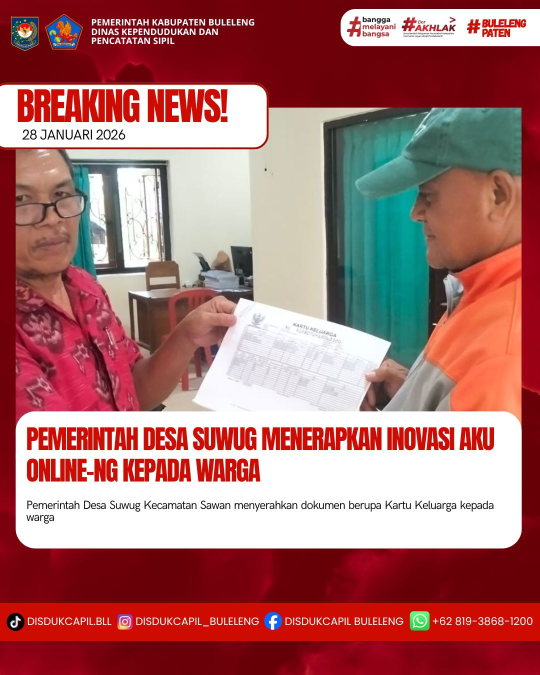 Pemerintah Kabupaten Buleleng melalui Dinas Kependudukan dan Pecatatan Sipil (Disdukcapil) Kabupaten Buleleng memaksimalkan serta mempermudah pelayanan kependudukan masyarakat dengan beberapa inovasi, melalui aplikasi AKU Online-NG. Dimana dalam penerapan aplikasi Aku Online-NG tersebut masyarakat tidak perlu lagi datang ke Dinas Dukcapil untuk melakukan pelayanan langsung cukup dengan datang ke Desa nanti akan dibantu oleh operator Desa masing-masing. Di Desa Suwug Kecamatan Sawan, Kasi Pemerintahan Desa Suwug telah menyerahkan dokumen kependudukan berupa Kartu Keluarga, Rabu (28/1).