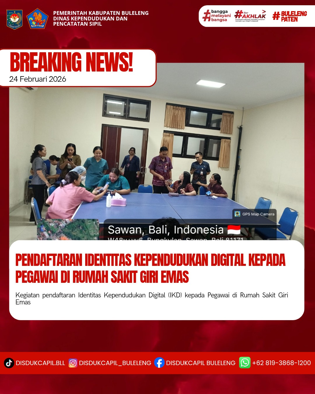 Menerapkan aturan pemerintah tersebut, Dinas Kependudukan dan Pencatatan Sipil Kabupaten Buleleng menyelenggarakan Pendaftaran Identitas Kependudukan Digital ke sekolah-sekolah, Dinas, Lembaga dan Perusahaan secara bergilir setiap harinya. Kali ini pelaksanaan pendaftaran Identitas Kependudukan Digital kepada Pegawai yang dilaksanakan di Rumah Sakit Giri Emas, Selasa (24/2).