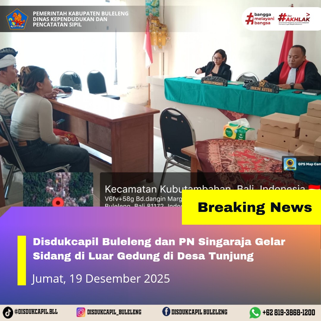 Pemerintah Kabupaten Buleleng melalui Dinas Kependudukan dan Pencatatan Sipil (Disdukcapil) menunjukkan komitmennya dalam mendekatkan pelayanan kepada masyarakat. Melalui inovasi SIAGAKU (Sidang Diluar Gedung dan Layanan Administrasi Kependudukan Terpadu), pelayanan persidangan perubahan identitas hukum dilaksanakan langsung di Kantor Perbekel Desa Tunjung, Kecamatan Kubutambahan, pada Jumat (19/12).