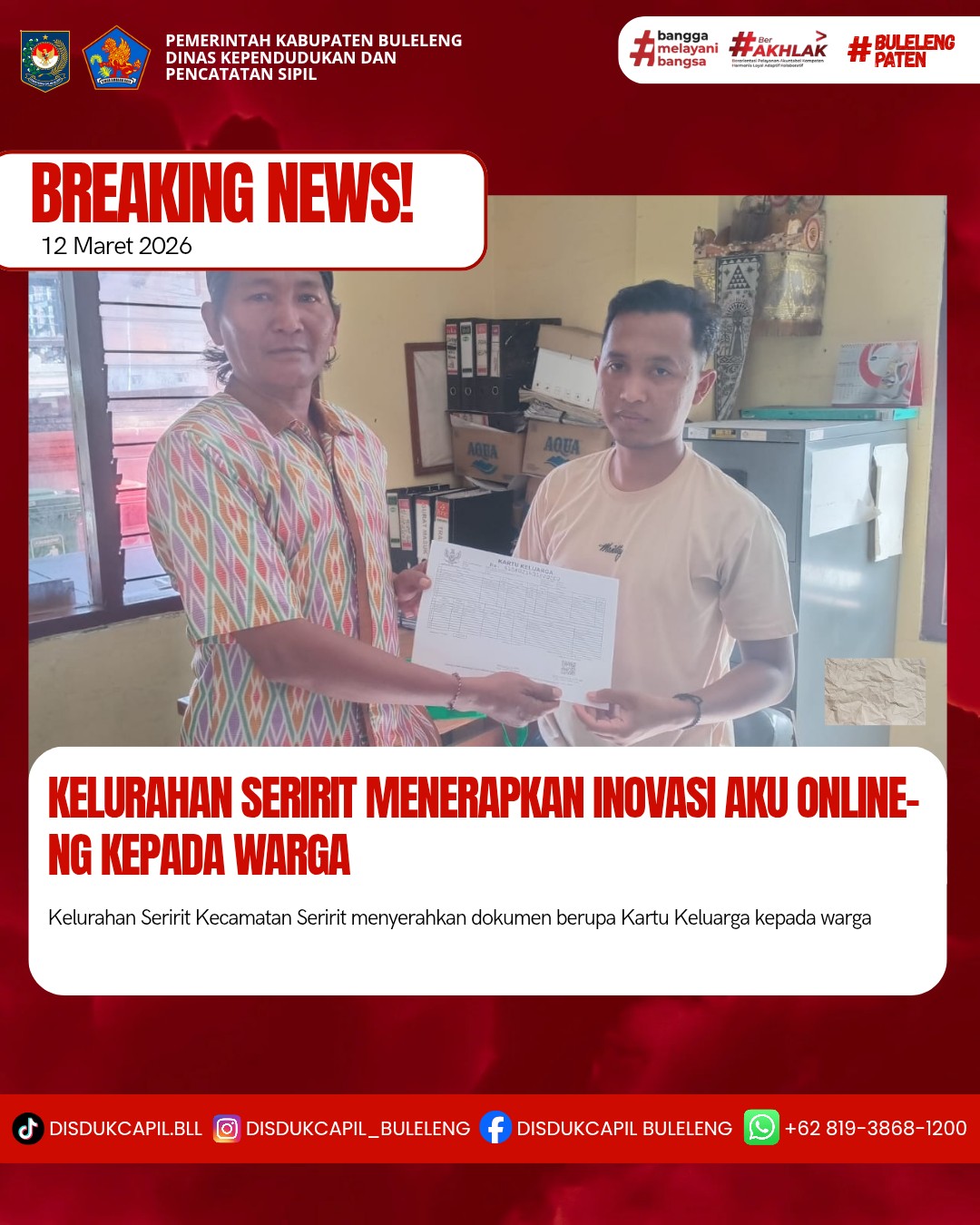 Pemerintah Kabupaten Buleleng melalui Dinas Kependudukan dan Pecatatan Sipil (Disdukcapil) Kabupaten Buleleng memaksimalkan serta mempermudah pelayanan kependudukan masyarakat dengan beberapa inovasi, melalui aplikasi AKU Online-NG. Dimana dalam penerapan aplikasi Aku Online-NG tersebut masyarakat tidak perlu lagi datang ke Dinas Dukcapil untuk melakukan pelayanan langsung cukup dengan datang ke Desa nanti akan dibantu oleh operator Desa masing-masing. Di Kelurahan Seririt Kecamatan Seririt, telah diserahkan dokumen kependudukan berupa Kartu Keluarga atas nama Imam Gozali Alfarisi yang diserahkan langsung oleh Kelurahan Seririt di Kecamatan Seririt, Kabupaten Buleleng, Kamis (12/3).