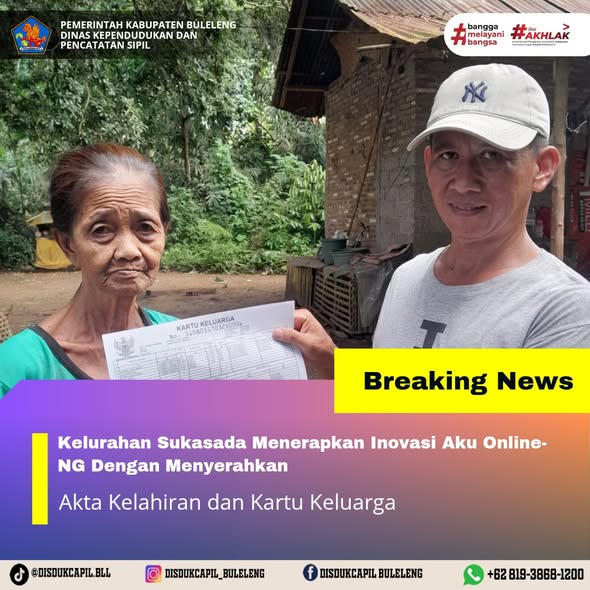 Pemerintah Kabupaten Buleleng melalui Dinas Kependudukan dan Pecatatan Sipil (Disdukcapil) Kabupaten Buleleng memaksimalkan serta mempermudah pelayanan kependudukan masyarakat dengan beberapa inovasi, melalui aplikasi AKU Online-NG. Dimana dalam penerapan aplikasi Aku Online-NG tersebut masyarakat tidak perlu lagi datang ke Dinas Dukcapil untuk melakukan pelayanan langsung cukup dengan datang ke Desa nanti akan dibantu oleh operator Desa masing-masing. Di Kelurahan Sukasada Kecamatan Sukasada, telah diserahkan dokumen kependudukan berupa Akta Kelahiran dan Kartu Keluarga atas nama Luh Darmiasih yang beralamat di Lingkungan Lumbanan, Kelurahan Sukasada yang diserahkan secara oleh Kepala Lingkungan Lumbanan Kelurahan Sukasada kepada warga, Senin (29/12).