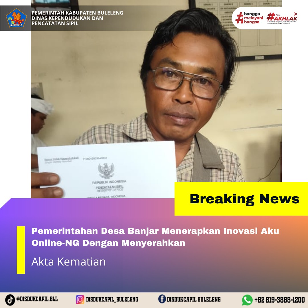 Pemerintah Kabupaten Buleleng melalui Dinas Kependudukan dan Pecatatan Sipil (Disdukcapil) Kabupaten Buleleng memaksimalkan serta mempermudah pelayanan kependudukan masyarakat dengan beberapa inovasi, melalui aplikasi AKU Online-NG. Dimana dalam penerapan aplikasi Aku Online-NG tersebut masyarakat tidak perlu lagi datang ke Dinas Dukcapil untuk melakukan pelayanan langsung cukup dengan datang ke Desa nanti akan dibantu oleh operator Desa masing-masing. Di Desa Banjar Kecamatan Banjar, telah diserahkan dokumen kependudukan berupa Akta Kematian atas nama DAYU PUTU DALENI dan Kartu Keluarga warga Banjar Dinas Pegentengan Desa Banjar yang diserahkan langsung oleh Pemerintah Desa Banjar Kecamatan Banjar, Kabupaten Buleleng, Kamis (4/12).