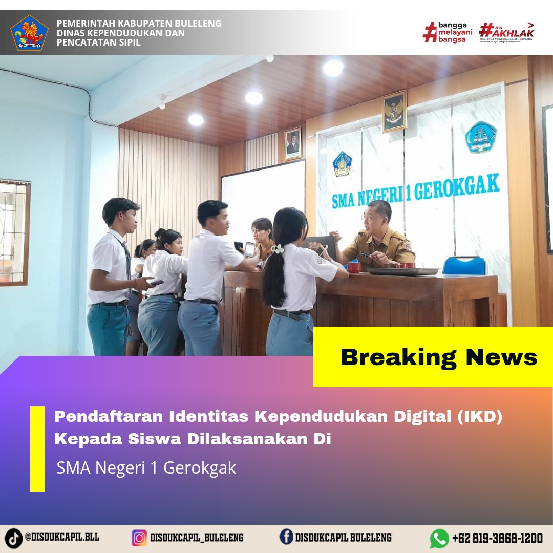 Menerapkan aturan pemerintah tersebut, Dinas Kependudukan dan Pencatatan Sipil Kabupaten Buleleng menyelenggarakan Pendaftaran Identitas Kependudukan Digital ke sekolah-sekolah, Dinas, Lembaga dan Perusahaan secara bergilir setiap harinya. Kali ini pelaksanaan pendaftaran Identitas Kependudukan Digital kepada Siswa yang dilaksanakan di SMA Negeri 1 Gerokgak, Senin (29/9).