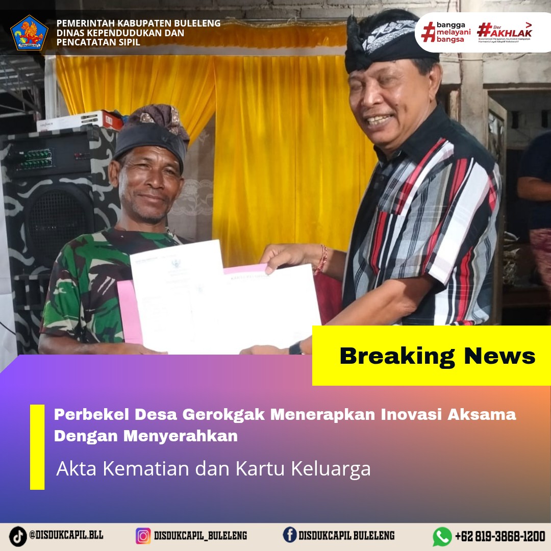 Pemerintah Kabupaten Buleleng melalui Dinas Kependudukan dan Pecatatan Sipil (Disdukcapil) Kabupaten Buleleng memaksimalkan serta mempermudah pelayanan kependudukan masyarakat dengan beberapa inovasi, yakni BALITA (Bayi Lahir Berakta), NYAKSI (Menyerahkan Akta Kawin Saat Acara Perkawinan) dan AKSAMA ( Akta Kematian Diserahkan Saat Masih Berduka) melalui aplikasi Aku Online-NG. Di Desa Gerokgak Kecamatan Gerokgak, telah diterapkan program Aksama (Akta Kematian Diserahkan Saat Masih Berduka) yang dilakukan secara langsung oleh Perbekel Desa Gerokgak I Nyoman Wijaya dengan menyerahkan Akta Kematian atas nama Gusti Kadek Kartini dan Kartu Keluarga atas nama Gusti Nyoman Suweca kepada keluarga almarhum di rumah duka Banjar Dinas Pucaksari, Desa Gerokgak, Jumat (2/1).