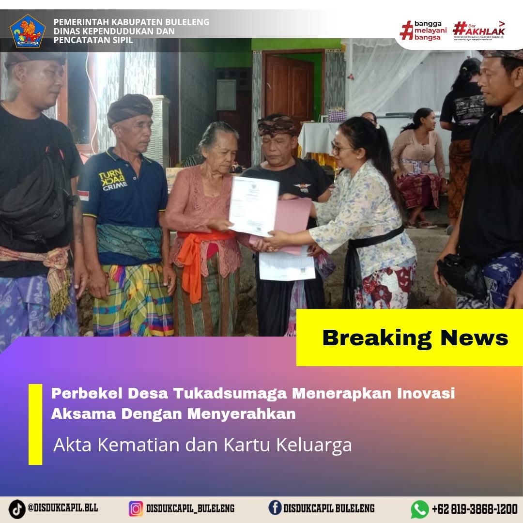 Pemerintah Kabupaten Buleleng melalui Dinas Kependudukan dan Pecatatan Sipil (Disdukcapil) Kabupaten Buleleng memaksimalkan serta mempermudah pelayanan kependudukan masyarakat dengan beberapa inovasi, yakni BALITA (Bayi Lahir Berakta), NYAKSI (Menyerahkan Akta Kawin Saat Acara Perkawinan) dan AKSAMA ( Akta Kematian Diserahkan Saat Masih Berduka) melalui aplikasi Aku Online. Di Desa Tukadsumaga Kecamatan Gerokgak, telah diterapkan program Aksama (Akta Kematian Diserahkan Saat Masih Berduka) yang dilakukan secara langsung oleh Perbekel Tukadsumaga ANAK AGUNG SRI WATHI dengan menyerahkan Akta Kematian atas nama I Nengah Gomboh dan Kartu Keluarga atas nama Ni Wayan Sadri kepada pihak keluarga almarhum di Desa Tukadusumaga Kecamatan Gerokgak, Jumat (21/11).