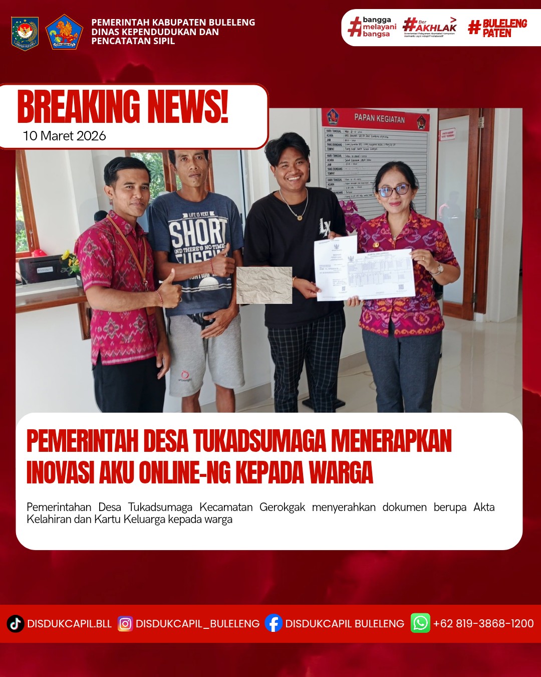 Pemerintah Kabupaten Buleleng melalui Dinas Kependudukan dan Pecatatan Sipil (Disdukcapil) Kabupaten Buleleng memaksimalkan serta mempermudah pelayanan kependudukan masyarakat dengan beberapa inovasi, melalui aplikasi AKU Online-NG. Dimana dalam penerapan aplikasi Aku Online-NG tersebut masyarakat tidak perlu lagi datang ke Dinas Dukcapil untuk melakukan pelayanan langsung cukup dengan datang ke Desa nanti akan dibantu oleh operator Desa masing-masing. Di Desa Tukadsumaga Kecamatan Gerokgak, telah diserahkan dokumen kependudukan berupa Akta Kelahiran atas nama I Wayan Suriadnyana dan Kartu Keluarga atas nama I Komang Sudarmayasa yang diserahkan oleh Perbekel Desa Tukadsumaga Anak Agung Sri Wathi didampingi oleh Kelian Banjar Dinas Gandongan Ketut Wira Sena di Desa Tukadsumaga, Selasa (10/3).