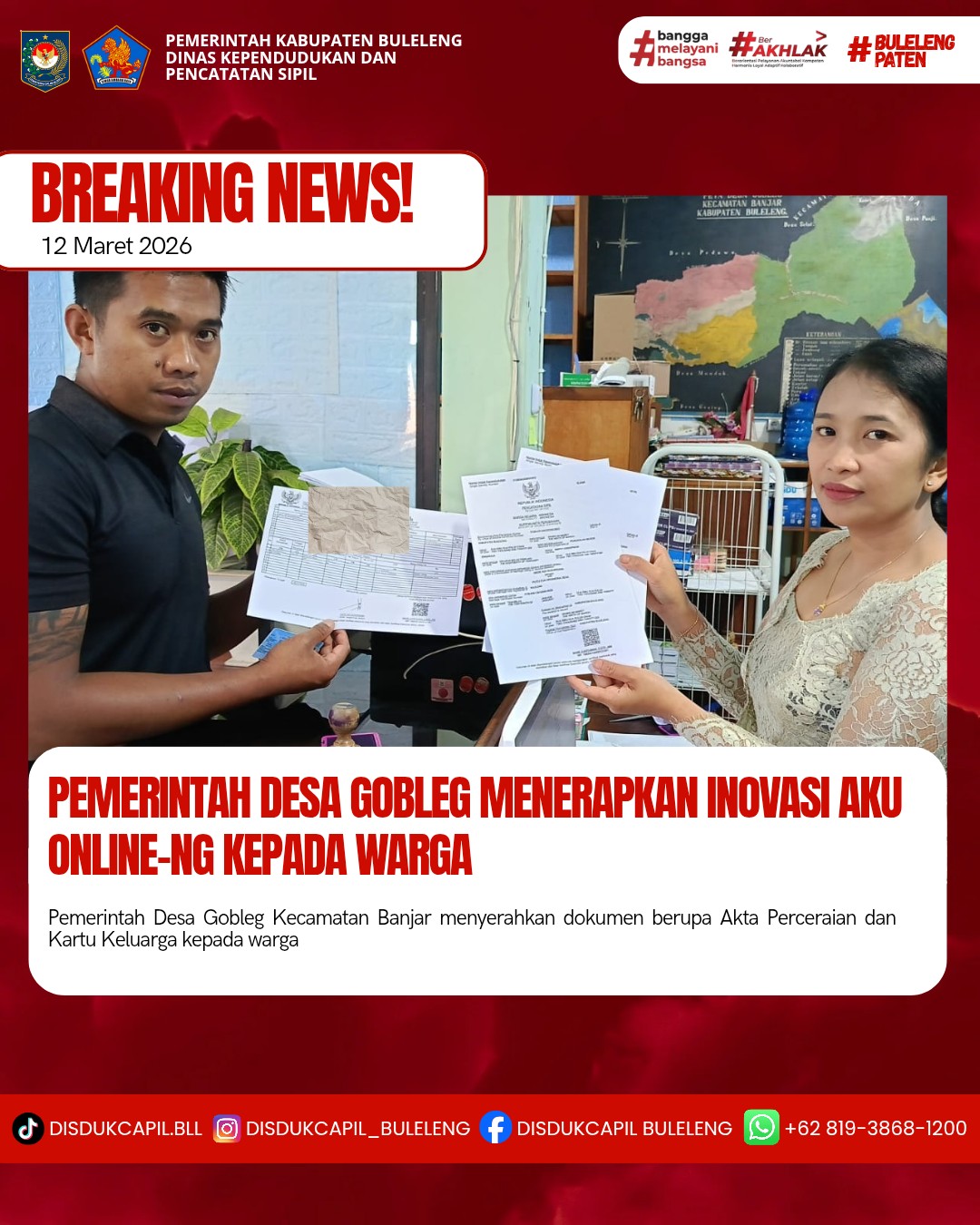 Pemerintah Kabupaten Buleleng melalui Dinas Kependudukan dan Pecatatan Sipil (Disdukcapil) Kabupaten Buleleng memaksimalkan serta mempermudah pelayanan kependudukan masyarakat dengan beberapa inovasi, melalui aplikasi AKU Online-NG. Dimana dalam penerapan aplikasi Aku Online-NG tersebut masyarakat tidak perlu lagi datang ke Dinas Dukcapil untuk melakukan pelayanan langsung cukup dengan datang ke Desa nanti akan dibantu oleh operator Desa masing-masing. Di Desa Gobleg Kecamatan Banjar, telah diserahkan dokumen kependudukan berupa Akta Perceraian dan Kartu Keluarga atas nama Gede Adi Sudarsana yang diserahkan langsung oleh staf administrasi Desa Gobleg bertempat di Kantor Perbekel Desa Gobleg, Kecamatan Banjar, Kabupaten Buleleng, Kamis (12/3).
