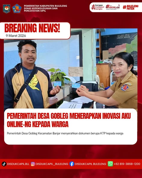 Pemerintah Kabupaten Buleleng melalui Dinas Kependudukan dan Pecatatan Sipil (Disdukcapil) Kabupaten Buleleng memaksimalkan serta mempermudah pelayanan kependudukan masyarakat dengan beberapa inovasi, melalui aplikasi AKU Online-NG. Dimana dalam penerapan aplikasi Aku Online-NG tersebut masyarakat tidak perlu lagi datang ke Dinas Dukcapil untuk melakukan pelayanan langsung cukup dengan datang ke Desa nanti akan dibantu oleh operator Desa masing-masing. Di Desa Gobleg Kecamatan Banjar, telah diserahkan dokumen kependudukan berupa KTP-El atas nama Made Suma Saputra dan Kadek Samiar yang diserahkan langsung oleh staf administrasi Desa Gobleg bertempat di Kantor Perbekel Desa Gobleg, Kecamatan Banjar, Kabupaten Buleleng, Senin (9/3).