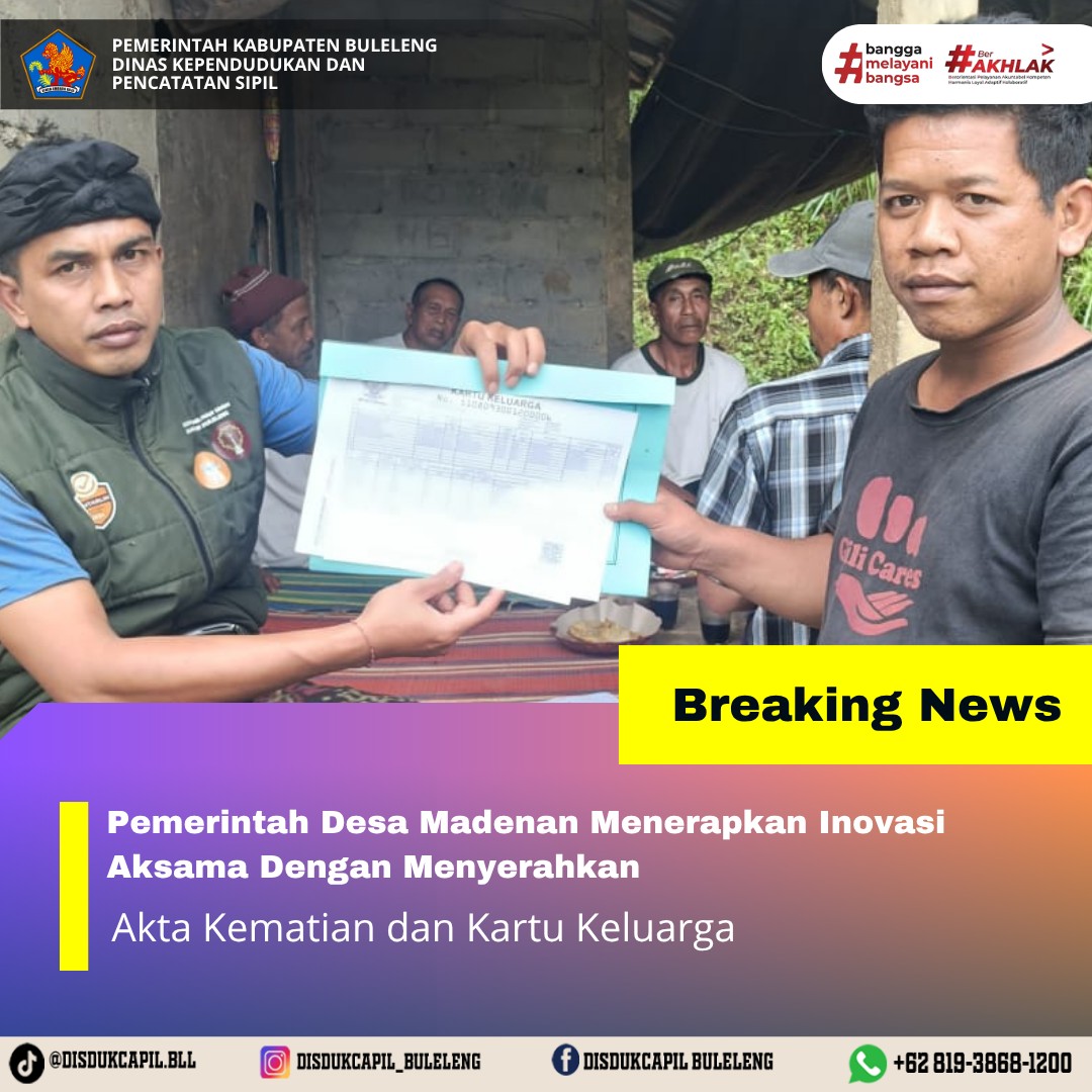 Pemerintah Kabupaten Buleleng melalui Dinas Kependudukan dan Pecatatan Sipil (Disdukcapil) Kabupaten Buleleng memaksimalkan serta mempermudah pelayanan kependudukan masyarakat dengan beberapa inovasi, yakni BALITA (Bayi Lahir Berakta), NYAKSI (Menyerahkan Akta Kawin Saat Acara Perkawinan) dan AKSAMA ( Akta Kematian Diserahkan Saat Masih Berduka) melalui aplikasi Aku Online. Di Desa Madenan Kecamatan Tejakula, telah diterapkan program Aksama (Akta Kematian Diserahkan Saat Masih Berduka) yang dilakukan secara langsung oleh Kelian Banjar Dinas Keduran Desa Madenan dengan menyerahkan Akta Kematian dan Kartu Keluarga atas nama Ketut Ari Aditya Putra beralamat Desa Madenan Kecamatan Tejakula, Jumat (14/11).