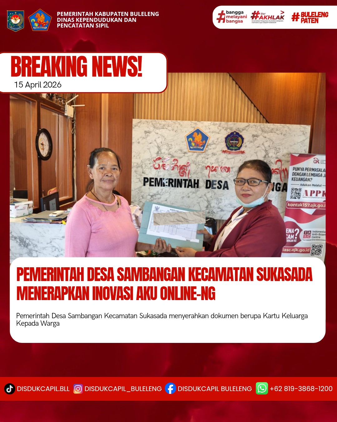 Pemerintah Kabupaten Buleleng melalui Dinas Kependudukan dan Pecatatan Sipil (Disdukcapil) Kabupaten Buleleng memaksimalkan serta mempermudah pelayanan kependudukan masyarakat dengan beberapa inovasi, melalui aplikasi AKU Online-NG. Dimana dalam penerapan aplikasi Aku Online-NG tersebut masyarakat tidak perlu lagi datang ke Dinas Dukcapil untuk melakukan pelayanan langsung, cukup dengan datang ke Desa nanti akan dibantu oleh operator Desa masing-masing. Di Desa Sambangan Kecamatan Sukasada, telah diserahkan dokumen kependudukan berupa Kartu Keluarga atas nama Ketut Widiasih warga BD. Babakan diserahkan oleh Kasi Pemerintahan Desa Sambangan yang bertempat di Kantor Perbekel Desa Sambangan, Kecamatan Sukasada, Kabupaten Buleleng, Rabu (15/4).