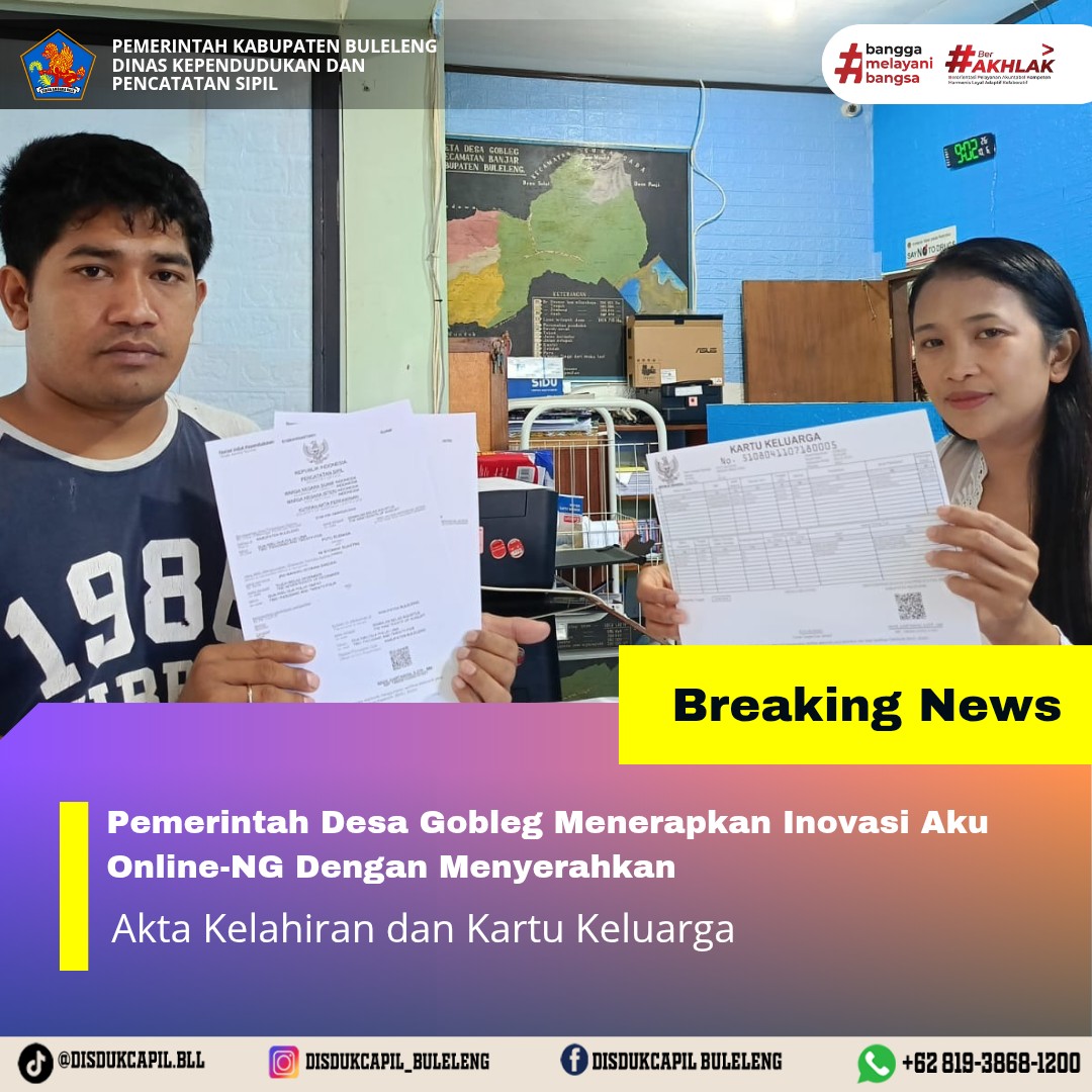 Pemerintah Kabupaten Buleleng melalui Dinas Kependudukan dan Pecatatan Sipil (Disdukcapil) Kabupaten Buleleng memaksimalkan serta mempermudah pelayanan kependudukan masyarakat dengan beberapa inovasi, melalui aplikasi AKU Online-NG. Dimana dalam penerapan aplikasi Aku Online-NG tersebut masyarakat tidak perlu lagi datang ke Dinas Dukcapil untuk melakukan pelayanan langsung cukup dengan datang ke Desa nanti akan dibantu oleh operator Desa masing-masing. Di Desa Gobleg Kecamatan Banjar, telah diserahkan dokumen kependudukan berupa Akta Kelahiran dan Kartu Keluarga atas nama PUTU BUDIASA yang diserahkan langsung oleh staf administrasi Desa Gobleg bertempat di Kantor Perbekel Desa Gobleg, Kecamatan Banjar, Kabupaten Buleleng, Senin (6/10).