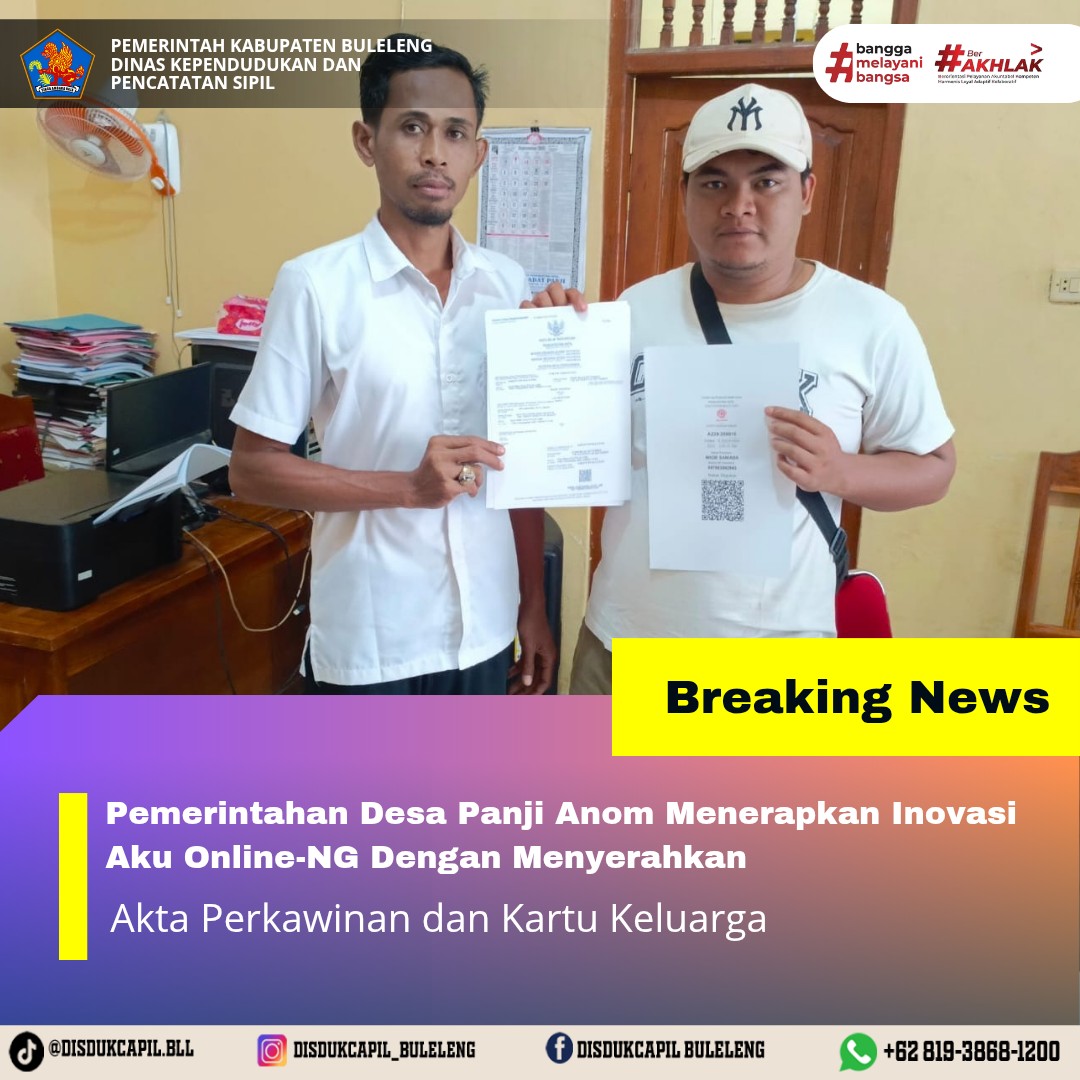 Pemerintah Kabupaten Buleleng melalui Dinas Kependudukan dan Pecatatan Sipil (Disdukcapil) Kabupaten Buleleng memaksimalkan serta mempermudah pelayanan kependudukan masyarakat dengan beberapa inovasi, melalui aplikasi AKU Online-NG. Dimana dalam penerapan aplikasi Aku Online-NG tersebut masyarakat tidak perlu lagi datang ke Dinas Dukcapil untuk melakukan pelayanan langsung cukup dengan datang ke Desa nanti akan dibantu oleh operator Desa masing-masing. Di Desa Panji Anom Kecamatan Sukasada, telah diserahkan dokumen kependudukan berupa Akta Perkawinan dan Kartu Keluarga atas nama MADE SANIADA diserahkan secara langsung oleh Kaur Perencanaan Desa Panji Anom, Rabu (17/9).