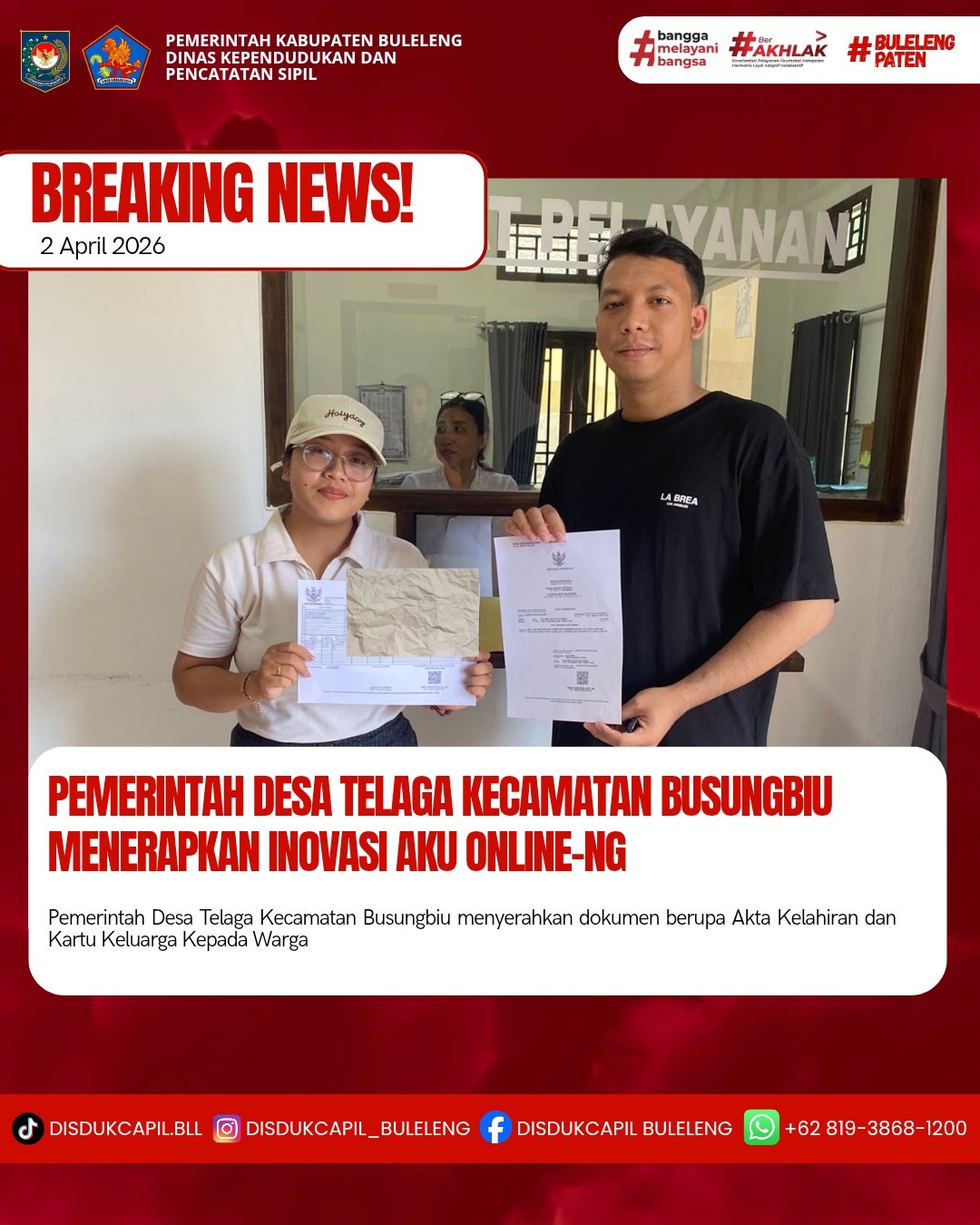 Pemerintah Kabupaten Buleleng melalui Dinas Kependudukan dan Pecatatan Sipil (Disdukcapil) Kabupaten Buleleng memaksimalkan serta mempermudah pelayanan kependudukan masyarakat dengan beberapa inovasi, melalui aplikasi AKU Online-NG. Dimana dalam penerapan aplikasi Aku Online-NG tersebut masyarakat tidak perlu lagi datang ke Dinas Dukcapil untuk melakukan pelayanan langsung cukup dengan datang ke Desa nanti akan dibantu oleh operator Desa masing-masing. Di Desa Telaga Kecamatan Busungbiu, telah diserahkan dokumen kependudukan berupa Akta Kelahiran atas nama I Putu Madhava Aryananda dan Kartu Keluarga atas nama I Kadek Bayu Permana yang diserahkan langsung oleh Operator Desa Telaga bertempat di Kantor Perbekel Desa Telaga yang beralamat di Banjar Dinas Kumuda Loka Desa Telaga Kecamatan Busungbiu Kabupaten Buleleng, Kamis (2/4).