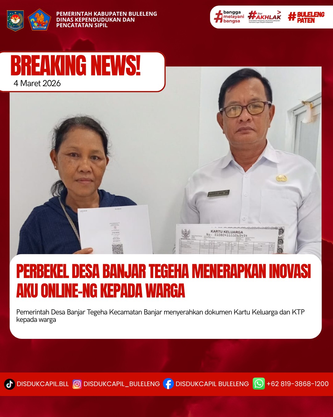 Pemerintah Kabupaten Buleleng melalui Dinas Kependudukan dan Pecatatan Sipil (Disdukcapil) Kabupaten Buleleng memaksimalkan serta mempermudah pelayanan kependudukan masyarakat dengan beberapa inovasi, melalui aplikasi AKU Online-NG. Dimana dalam penerapan aplikasi Aku Online-NG tersebut masyarakat tidak perlu lagi datang ke Dinas Dukcapil untuk melakukan pelayanan langsung cukup dengan datang ke Desa nanti akan dibantu oleh operator Desa masing-masing. Di Desa Banjar Tegeha Kecamatan Banjar, telah diserahkan dokumen kependudukan berupa Kartu Keluarga dan KTP atas nama Ketut Nada warga Banjar Dinas Abian Desa Banjar Tegeha yang diserahkan secara langsung oleh Perbekel Desa Banjar Tegeha Ida Bagus Komang Sistiadi, Rabu (4/3).