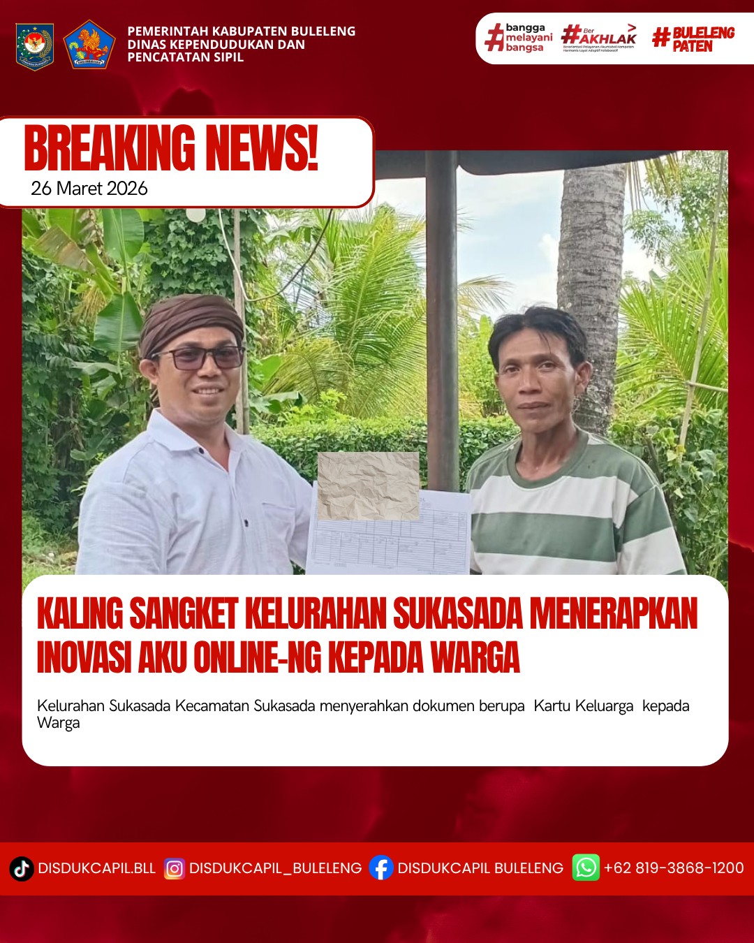 Pemerintah Kabupaten Buleleng melalui Dinas Kependudukan dan Pecatatan Sipil (Disdukcapil) Kabupaten Buleleng memaksimalkan serta mempermudah pelayanan kependudukan masyarakat dengan beberapa inovasi, melalui aplikasi AKU Online-NG. Dimana dalam penerapan aplikasi Aku Online-NG tersebut masyarakat tidak perlu lagi datang ke Dinas Dukcapil untuk melakukan pelayanan langsung, cukup dengan datang ke Desa nanti akan dibantu oleh operator Desa masing-masing. Di Kelurahan Sukasada Kecamatan Sukasada, telah diserahkan dokumen kependudukan berupa Kartu Keluarga atas nama Nyoman Mertada warga Lingkungan Sangket, Kelurahan Sukasada yang diserahkan langsung oleh Kepala Lingkungan Sangket Kelurahan Sukasada Kecamatan Sukasada, Kabupaten Buleleng, Kamis (26/3).