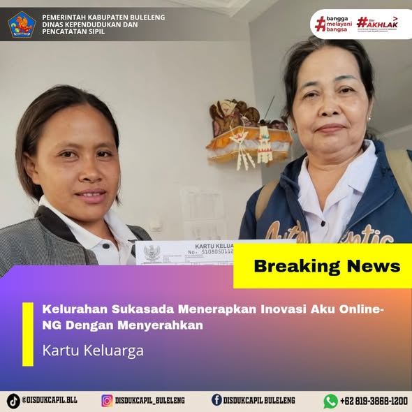 Pemerintah Kabupaten Buleleng melalui Dinas Kependudukan dan Pecatatan Sipil (Disdukcapil) Kabupaten Buleleng memaksimalkan serta mempermudah pelayanan kependudukan masyarakat dengan beberapa inovasi, melalui aplikasi AKU Online-NG. Dimana dalam penerapan aplikasi Aku Online-NG tersebut masyarakat tidak perlu lagi datang ke Dinas Dukcapil untuk melakukan pelayanan langsung cukup dengan datang ke Desa nanti akan dibantu oleh operator Desa masing-masing. Di Kelurahan Sukasada Kecamatan Sukasada, telah diserahkan dokumen kependudukan berupa Kartu Keluarga atas nama Ketut Sumeningsih yang diserahkan langsung oleh Plt. Kepala lingkungan Sukasada Kecamatan Sukasada bertempat di kantor Kelurahan Sukasada Kecamatan Sukasada, Kabupaten Buleleng, Rabu (26/11).