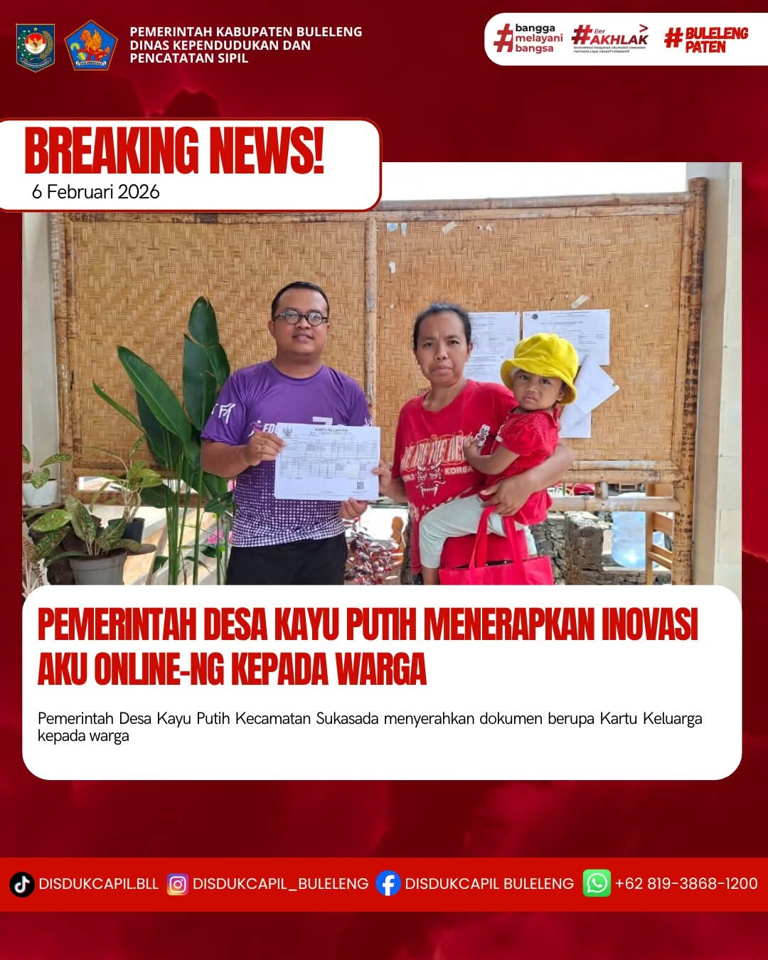 Pemerintah Kabupaten Buleleng melalui Dinas Kependudukan dan Pecatatan Sipil (Disdukcapil) Kabupaten Buleleng memaksimalkan serta mempermudah pelayanan kependudukan masyarakat dengan beberapa inovasi, melalui aplikasi AKU Online-NG. Dimana dalam penerapan aplikasi Aku Online-NG tersebut masyarakat tidak perlu lagi datang ke Dinas Dukcapil untuk melakukan pelayanan langsung cukup dengan datang ke Desa nanti akan dibantu oleh operator Desa masing-masing. Di Desa Kayu Putih Kecamatan Sukasada, telah diserahkan dokumen kependudukan berupa Kartu Keluarga atas nama Ketut Sudiasa warga Banjar Dinas Kayuputih, Desa Kayu Putih, Kecamatan Sukasada yang diserahkan secara langsung oleh Kasi Kesejahteraan Desa Kayu Putih Kecamatan Sukasada, Jumat (6/2).