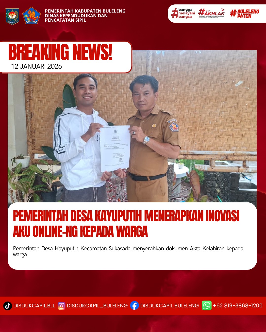 Pemerintah Kabupaten Buleleng melalui Dinas Kependudukan dan Pecatatan Sipil (Disdukcapil) Kabupaten Buleleng memaksimalkan serta mempermudah pelayanan kependudukan masyarakat dengan beberapa inovasi, melalui aplikasi AKU Online-NG. Dimana dalam penerapan aplikasi Aku Online-NG tersebut masyarakat tidak perlu lagi datang ke Dinas Dukcapil untuk melakukan pelayanan langsung cukup dengan datang ke Desa nanti akan dibantu oleh operator Desa masing-masing. Di Desa Kayuputih Kecamatan Sukasada, telah diserahkan dokumen kependudukan berupa Akta Kelahiran atas nama Nengah Sumardika, Banjar Dinas Melaka, Desa Kayu Putih, Kecamatan Sukasada yang diserahkan secara langsung oleh Kasi Pemerintahan Desa Kayuputih Kecamatan Sukasada, Senin (12/1).