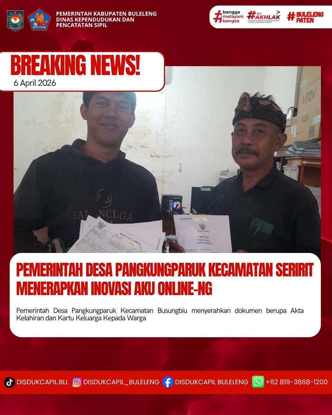 Pemerintah Kabupaten Buleleng melalui Dinas Kependudukan dan Pecatatan Sipil (Disdukcapil) Kabupaten Buleleng memaksimalkan serta mempermudah pelayanan kependudukan masyarakat dengan beberapa inovasi, melalui aplikasi AKU Online-NG. Dimana dalam penerapan aplikasi Aku Online-NG tersebut masyarakat tidak perlu lagi datang ke Dinas Dukcapil untuk melakukan pelayanan langsung, cukup dengan datang ke Desa nanti akan dibantu oleh operator Desa masing-masing. Di Desa Pangkungparuk Kecamatan Seririt, telah diserahkan dokumen kependudukan berupa Akta Kelahiran atas nama Gede Dyrensky Sankara Ananta dan Kartu Keluarga atas nama Kadek Darma Wiguna warga banjar dinas pangkungparuk,Desa Pangkungparuk yang diserahkan oleh Kepala Dusun Desa Pangkungparuk , Senin (6/4).