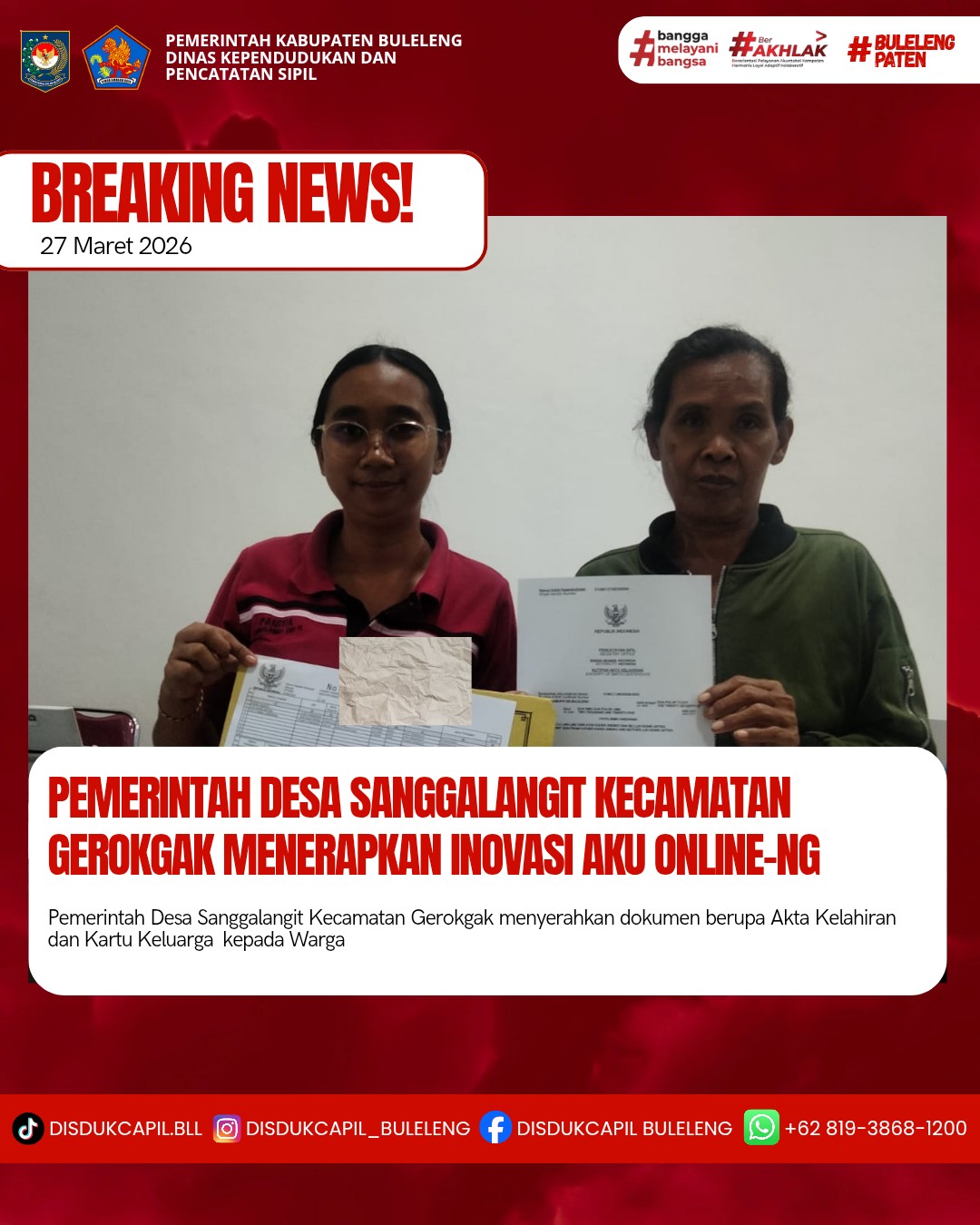 Pemerintah Kabupaten Buleleng melalui Dinas Kependudukan dan Pecatatan Sipil (Disdukcapil) Kabupaten Buleleng memaksimalkan serta mempermudah pelayanan kependudukan masyarakat dengan beberapa inovasi, melalui aplikasi AKU Online-NG. Dimana dalam penerapan aplikasi Aku Online-NG tersebut masyarakat tidak perlu lagi datang ke Dinas Dukcapil untuk melakukan pelayanan langsung, cukup dengan datang ke Desa nanti akan dibantu oleh operator Desa masing-masing. Di Desa Sanggalangit Kecamatan Gerokgak, telah diserahkan dokumen kependudukan berupa Akta Kelahiran dan Kartu Keluarga kepada warga atas nama Kadek Andiko warga Banjar Dinas Tamansari Desa Sanggalangit Kecamatan Gerokgak yang diserahkan langsung oleh Operator Aku Online, Desa Sanggalangit , Jumat (27/3).