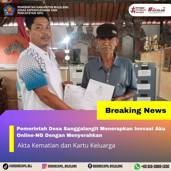 Pemerintah Kabupaten Buleleng melalui Dinas Kependudukan dan Pecatatan Sipil (Disdukcapil) Kabupaten Buleleng memaksimalkan serta mempermudah pelayanan kependudukan masyarakat dengan beberapa inovasi, melalui aplikasi AKU Online. Dimana dalam penerapan aplikasi Aku Online tersebut masyarakat tidak perlu lagi datang ke Dinas Dukcapil untuk melakukan pelayanan langsung cukup dengan datang ke Desa nanti akan dibantu oleh operator Desa masing-masing. Di Desa Sanggalangit Kecamatan Gerokgak telah diserahkan dokumen kependudukan berupa Akta Kematian dan Kartu Keluarga kepada warga Banjar Dinas Tukadpule Desa Sanggalangit yang diserahkan oleh Kelian Banjar Dinas Tukadpule, Desa Sanggalangit Kecamatan Gerokgak, Rabu (29/10).