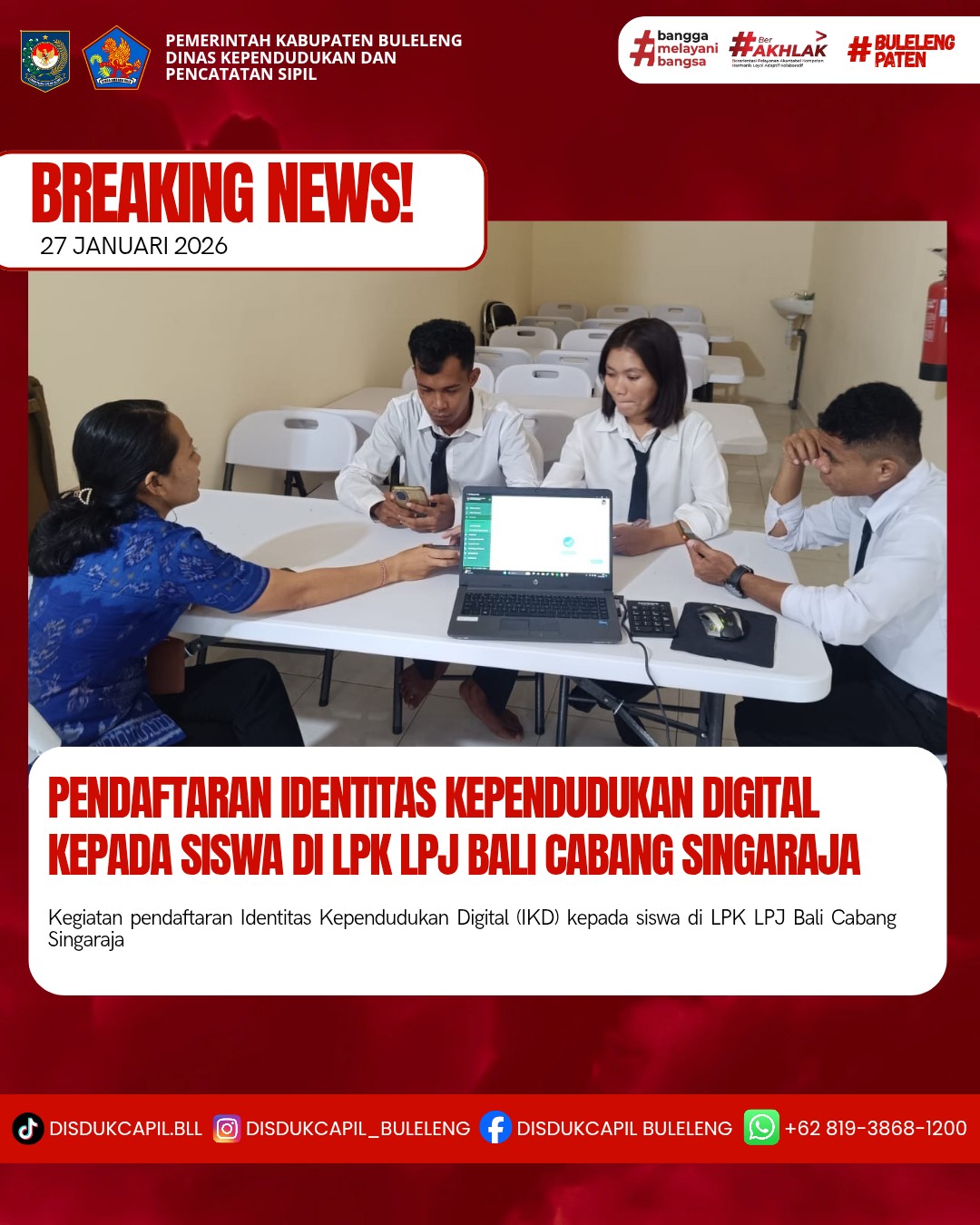 Menerapkan aturan pemerintah tersebut, Dinas Kependudukan dan Pencatatan Sipil Kabupaten Buleleng menyelenggarakan Pendaftaran Identitas Kependudukan Digital ke sekolah-sekolah, Dinas, Lembaga dan Perusahaan secara bergilir setiap harinya. Kali ini pelaksanaan pendaftaran Identitas Kependudukan Digital kepada siswa yang dilaksanakan di LPK LPJ Bali Cabang Singaraja, Selasa (27/1).