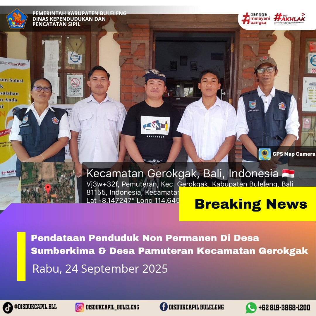 Kali ini Rabu, 24 September 2025, Dinas Kependudukan dan Pencatatan Sipil Kabupaten Buleleng melaksanakan kegiatan pendataan penduduk Non Permanen di Desa Sumberkima dan Desa Pamuteran Kecamatan Gerokgak. Dari pendataan penduduk kali ini didapatkan hasil :