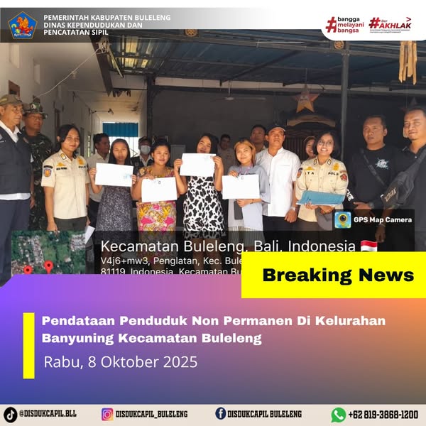 Kali ini Rabu, 8 Oktober 2025, Dinas Kependudukan dan Pencatatan Sipil Kabupaten Buleleng melaksanakan kegiatan pendataan penduduk Non Permanen di Kelurahan Bnayuning Kecamatan Buleleng. Dari pendataan penduduk kali ini didapatkan hasil :