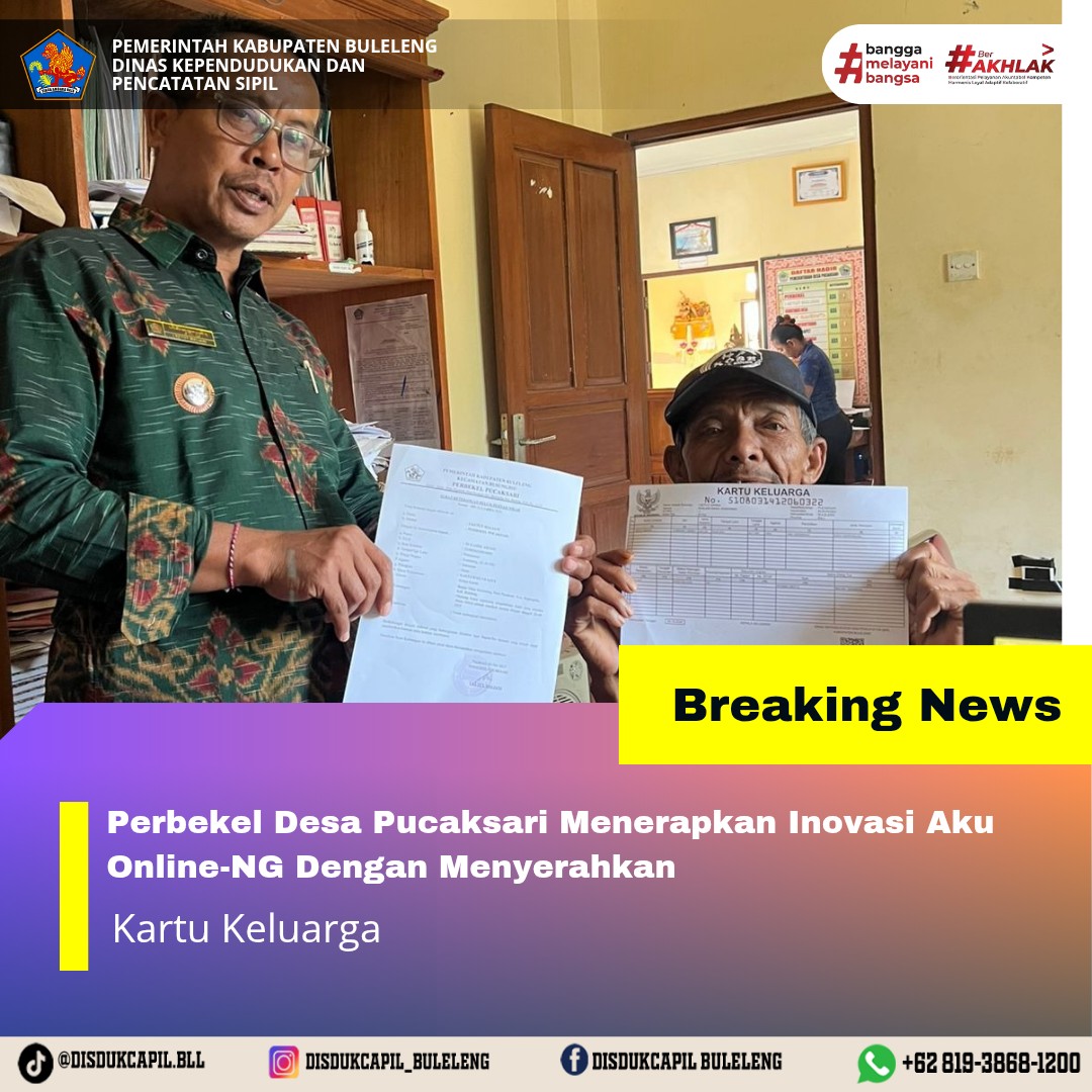 Pemerintah Kabupaten Buleleng melalui Dinas Kependudukan dan Pecatatan Sipil (Disdukcapil) Kabupaten Buleleng memaksimalkan serta mempermudah pelayanan kependudukan masyarakat dengan beberapa inovasi, melalui aplikasi AKU Online-NG. Dimana dalam penerapan aplikasi Aku Online-NG tersebut masyarakat tidak perlu lagi datang ke Dinas Dukcapil untuk melakukan pelayanan langsung cukup dengan datang ke Desa nanti akan dibantu oleh operator Desa masing-masing. Di Desa Pucaksari Kecamatan Busungbiu, telah diserahkan dokumen kependudukan berupa Kartu Keluarga atas nama I KETUT SANDA yang diserahkan langsung oleh Perbekel Desa Pucaksari I Ketut Maliani, Selasa (7/10).