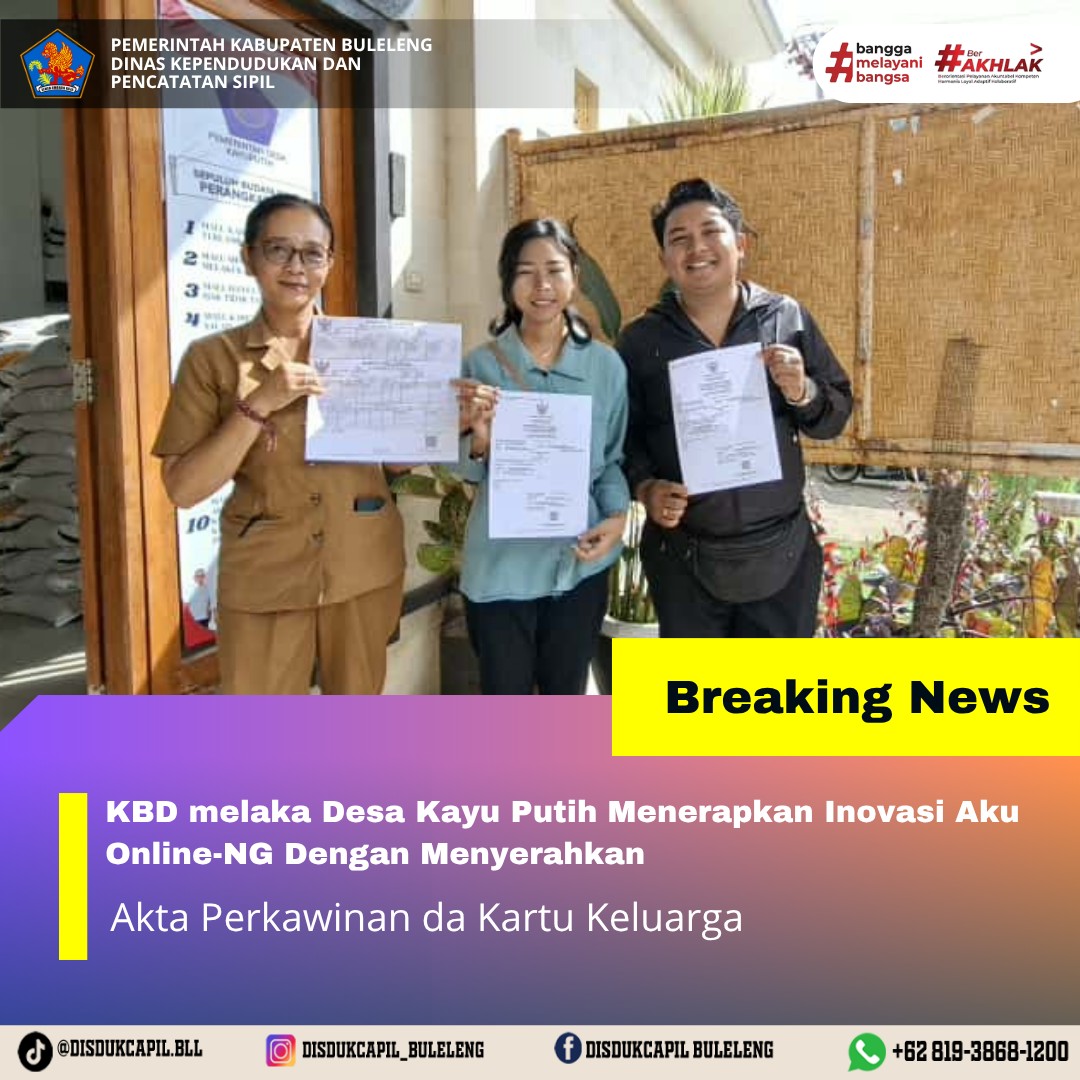 Pemerintah Kabupaten Buleleng melalui Dinas Kependudukan dan Pecatatan Sipil (Disdukcapil) Kabupaten Buleleng memaksimalkan serta mempermudah pelayanan kependudukan masyarakat dengan beberapa inovasi, melalui aplikasi AKU Online-NG. Dimana dalam penerapan aplikasi Aku Online-NG tersebut masyarakat tidak perlu lagi datang ke Dinas Dukcapil untuk melakukan pelayanan langsung cukup dengan datang ke Desa nanti akan dibantu oleh operator Desa masing-masing. Di Desa Kayuputih Kecamatan Sukasada, telah diserahkan dokumen kependudukan berupa Akta Perkawinan atas nama Putu Eka Saputra dan Ni Ketut Novianti dan Kartu Keluarga atas nama Putu Eka Saputra dan Gede Sumitra yang diserahkan langsung oleh KBD Melaka Desa Kayuputih Kecamatan Sukasada bertempat di kantor Perbekel Desa Kayuputih, Kecamatan Sukasada, Kabupaten Buleleng, Senin (17/11).