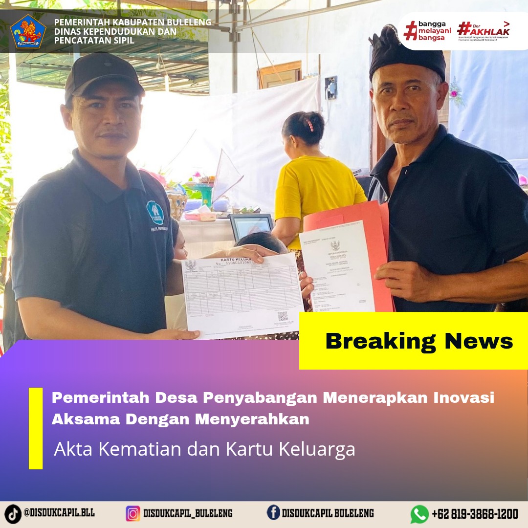 Pemerintah Kabupaten Buleleng melalui Dinas Kependudukan dan Pecatatan Sipil (Disdukcapil) Kabupaten Buleleng memaksimalkan serta mempermudah pelayanan kependudukan masyarakat dengan beberapa inovasi, yakni BALITA (Bayi Lahir Berakta), NYAKSI (Menyerahkan Akta Kawin Saat Acara Perkawinan) dan AKSAMA ( Akta Kematian Diserahkan Saat Masih Berduka) melalui aplikasi Aku Online. Di Desa Penyabangan Kecamatan Gerokgak, telah diterapkan program Aksama (Akta Kematian Diserahkan Saat Masih Berduka) yang dilakukan secara langsung oleh Pemerintah Desa Penyabangan dengan menyerahkan Akta Kematian atas nama Nyoman Buda dan Kartu Keluarga atas nama Wayan Windres di Desa Penyabangan Kecamatan Gerokgak, Jumat (1/8).