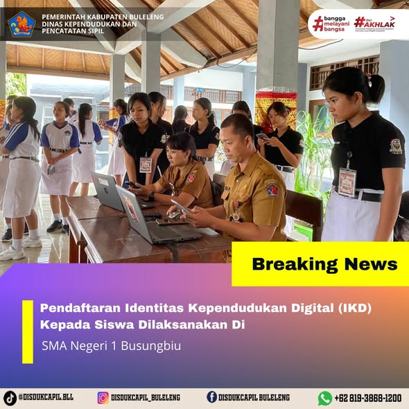 Menerapkan aturan pemerintah tersebut, Dinas Kependudukan dan Pencatatan Sipil Kabupaten Buleleng menyelenggarakan Pendaftaran Identitas Kependudukan Digital ke sekolah-sekolah, Dinas, Lembaga dan Perusahaan secara bergilir setiap harinya. Kali ini pelaksanaan pendaftaran Identitas Kependudukan Digital kepada siswa yang dilaksanakan di SMA Negeri 1 Busungbiu, Senin (15/12).