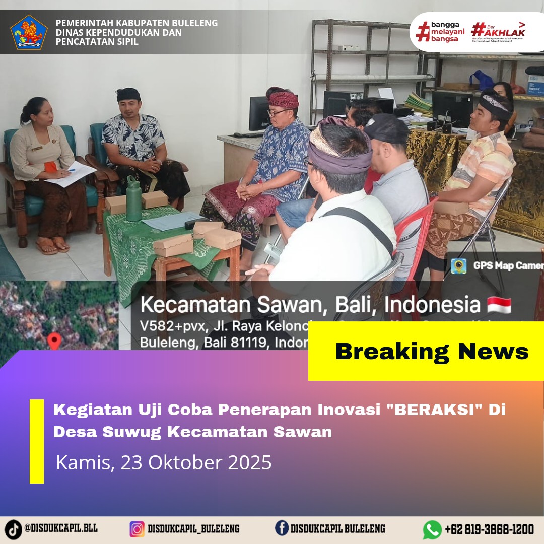Kepala Bidang Pelayanan dan Pencatatan Sipil Disdukcapil Kabupaten Buleleng melaksanakan kegiatan uji coba penerapan Inovasi "BERAKSI" Di Desa Suwug Kecamatan Sawan. Inovasi "BERAKSI" (Bertemu Warga Untuk Konsultasi dan Memberi Solusi) merupakan Inovasi baru di Disdukcapil Buleleng sebagai upaya membantu masyarakat dalam memberikan solusi dalam mengatasi permasalahan administrasi kependudukan dengan datang ke Desa dan langsung bertemu dengan masyarakat.