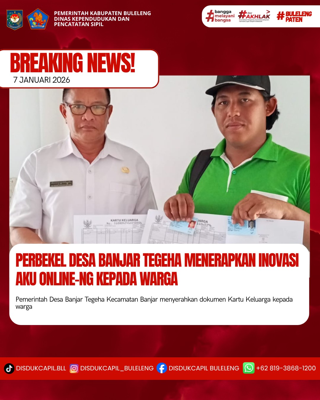 Pemerintah Kabupaten Buleleng melalui Dinas Kependudukan dan Pecatatan Sipil (Disdukcapil) Kabupaten Buleleng memaksimalkan serta mempermudah pelayanan kependudukan masyarakat dengan beberapa inovasi, melalui aplikasi AKU Online-NG. Dimana dalam penerapan aplikasi Aku Online-NG tersebut masyarakat tidak perlu lagi datang ke Dinas Dukcapil untuk melakukan pelayanan langsung cukup dengan datang ke Desa nanti akan dibantu oleh operator Desa masing-masing. Di Desa Banjar Tegeha Kecamatan Banjar, telah diserahkan dokumen kependudukan berupa Kartu Keluarga atas nama Kadek Arnanya, Komang Sareni dan Putu Pariasa warga Banjar Dinas Tangeb Desa Banjar Tegeha yang diserahkan secara langsung oleh Perbekel Desa Banjar Tegeha Ida Bagus Komang Sistiadi, Rabu (7/1).