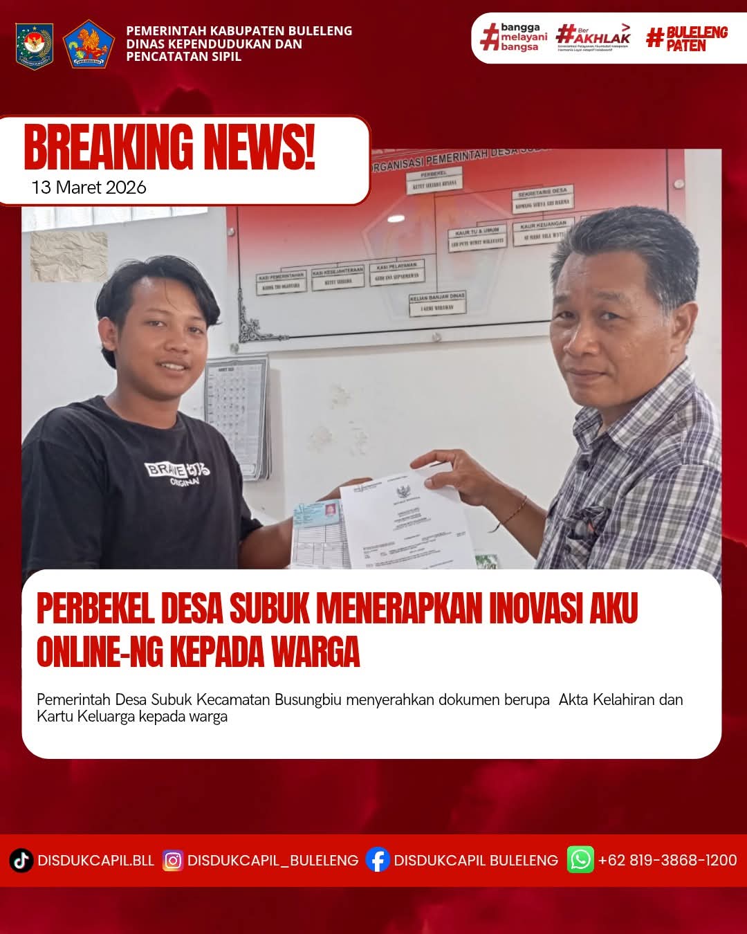 Pemerintah Kabupaten Buleleng melalui Dinas Kependudukan dan Pecatatan Sipil (Disdukcapil) Kabupaten Buleleng memaksimalkan serta mempermudah pelayanan kependudukan masyarakat dengan beberapa inovasi, melalui aplikasi AKU Online-NG. Dimana dalam penerapan aplikasi Aku Online-NG tersebut masyarakat tidak perlu lagi datang ke Dinas Dukcapil untuk melakukan pelayanan langsung cukup dengan datang ke Desa nanti akan dibantu oleh operator Desa masing-masing. Di Desa Subuk Kecamatan Busungbiu, telah diserahkan dokumen kependudukan berupa Akta Kelahiran dan Kartu Keluarga atas nama Ketut Landep diserahkan oleh Perbekel Desa Subuk Ketut Suliada Kusana bertempat di Kantor Perbekel Desa Subuk, Kecamatan Busungbiu, Kabupaten Buleleng, Jumat (13/3).