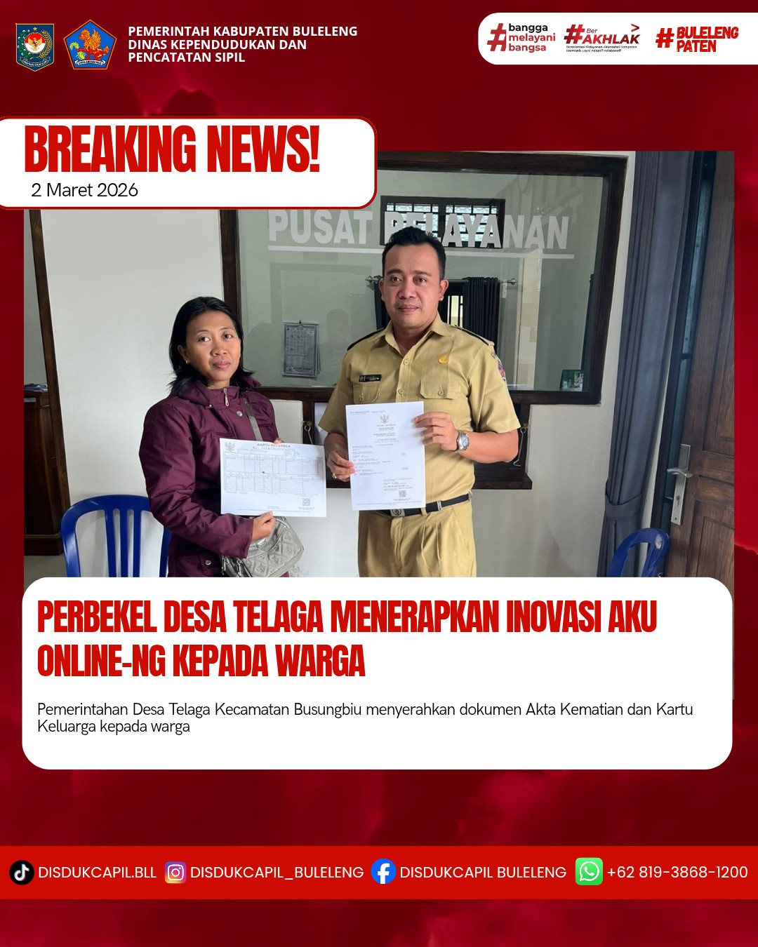 Pemerintah Kabupaten Buleleng melalui Dinas Kependudukan dan Pecatatan Sipil (Disdukcapil) Kabupaten Buleleng memaksimalkan serta mempermudah pelayanan kependudukan masyarakat dengan beberapa inovasi, melalui aplikasi AKU Online-NG. Dimana dalam penerapan aplikasi Aku Online-NG tersebut masyarakat tidak perlu lagi datang ke Dinas Dukcapil untuk melakukan pelayanan langsung cukup dengan datang ke Desa nanti akan dibantu oleh operator Desa masing-masing. Di Desa Telaga Kecamatan Busungbiu, telah diserahkan dokumen kependudukan berupa Kartu Keluarga atas nama Ni Nyoman Masiani serta Akta Kematian Anak atas nama I Nengah Rinta yang diserahkan langsung oleh Perbekel Desa Telaga MADE HENDRA MAHAYUDA,S.PD bertempat di Kantor Perbekel Desa Telaga, Kecamatan Busungbi, Kabupaten Buleleng, Senin (2/3).