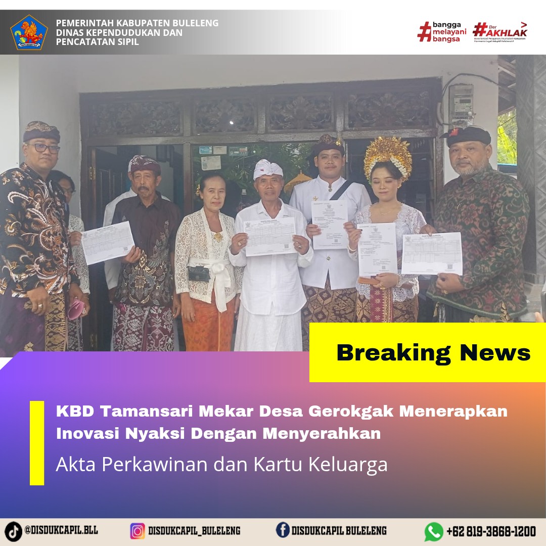 Pemerintah Kabupaten Buleleng melalui Dinas Kependudukan dan Pecatatan Sipil (Disdukcapil) Kabupaten Buleleng memaksimalkan serta mempermudah pelayanan kependudukan masyarakat dengan beberapa inovasi, yakni BALITA (Bayi Lahir Berakta), NYAKSI (Menyerahkan Akta Kawin Saat Acara Perkawinan) dan AKSAMA ( Akta Kematian Diserahkan Saat Masih Berduka) melalui aplikasi Aku Online-NG. Di Desa Gerokgak Kecamatan Gerokgak, telah diterapkan program NYAKSI (Menyerahkan Akta Perkawinan Saat Acara Perkawinan) yang dilakukan secara langsung oleh Kelian Banjar Dinas Tamansari Mekar dengan menyerahkan Akta Perkawinan atas nama I Ketut Adi Susawan dan Kartu Keluarga atas nama I Ketut Adi Susawan dan Ketut Semadi kepada kedua mempelai dan masing-masing orang tua mempelai di Desa Gerokgak Kecamatan Gerokgak, Senin (17/11).