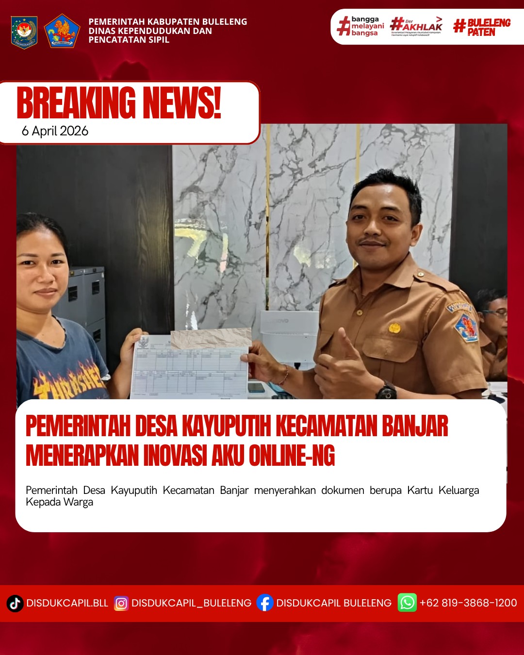 Pemerintah Kabupaten Buleleng melalui Dinas Kependudukan dan Pecatatan Sipil (Disdukcapil) Kabupaten Buleleng memaksimalkan serta mempermudah pelayanan kependudukan masyarakat dengan beberapa inovasi, melalui aplikasi AKU Online-NG. Dimana dalam penerapan aplikasi Aku Online-NG tersebut masyarakat tidak perlu lagi datang ke Dinas Dukcapil untuk melakukan pelayanan langsung, cukup dengan datang ke Desa nanti akan dibantu oleh operator Desa masing-masing. Di Desa Kayuputih Kecamatan Banjar, telah diserahkan dokumen kependudukan berupa Kartu Keluarga kepada warga Banjar Dinas Menagung, Desa Kayuputih Kecamatan Banjar yang diserahkan secara langsung oleh Kasi Pemerintahan Desa Kayuputih Kecamatan Banjar , Senin (6/4).