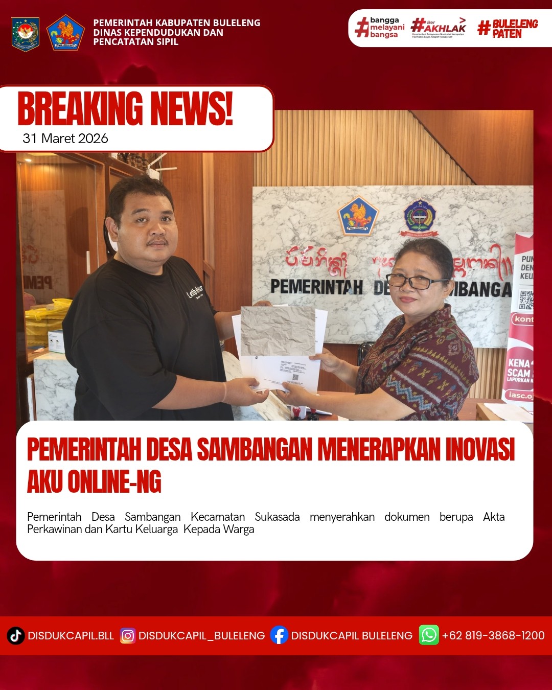 Pemerintah Kabupaten Buleleng melalui Dinas Kependudukan dan Pecatatan Sipil (Disdukcapil) Kabupaten Buleleng memaksimalkan serta mempermudah pelayanan kependudukan masyarakat dengan beberapa inovasi, melalui aplikasi AKU Online-NG. Dimana dalam penerapan aplikasi Aku Online-NG tersebut masyarakat tidak perlu lagi datang ke Dinas Dukcapil untuk melakukan pelayanan langsung, cukup dengan datang ke Desa nanti akan dibantu oleh operator Desa masing-masing. Di Desa Sambangan Kecamatan Sukasada, telah diserahkan dokumen kependudukan berupa Akta Perkawinan atas nama Gusti Ferdi Prasetya dan Kartu Keluarga warga BD. Babakan diserahkan oleh Kasi Pemerintahan Desa Sambangan yang bertempat di Kantor Perbekel Desa Sambangan, Kecamatan Sukasada, Kabupaten Buleleng, Selasa (31/3).