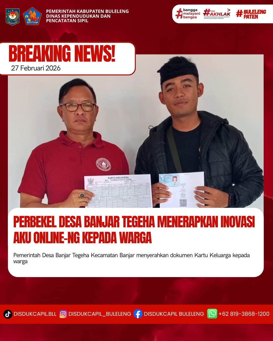 Pemerintah Kabupaten Buleleng melalui Dinas Kependudukan dan Pecatatan Sipil (Disdukcapil) Kabupaten Buleleng memaksimalkan serta mempermudah pelayanan kependudukan masyarakat dengan beberapa inovasi, melalui aplikasi AKU Online-NG. Dimana dalam penerapan aplikasi Aku Online-NG tersebut masyarakat tidak perlu lagi datang ke Dinas Dukcapil untuk melakukan pelayanan langsung cukup dengan datang ke Desa nanti akan dibantu oleh operator Desa masing-masing. Di Desa Banjar Tegeha Kecamatan Banjar, telah diserahkan dokumen kependudukan berupa Kartu Keluarga dan KTP atas nama Nyoman Suka Wardana warga Desa Banjar Dinas Abian Desa Banjar Tegeha yang diserahkan secara langsung oleh Perbekel Desa Banjar Tegeha Ida Bagus Komang Sistiadi, Jumat (27/2).