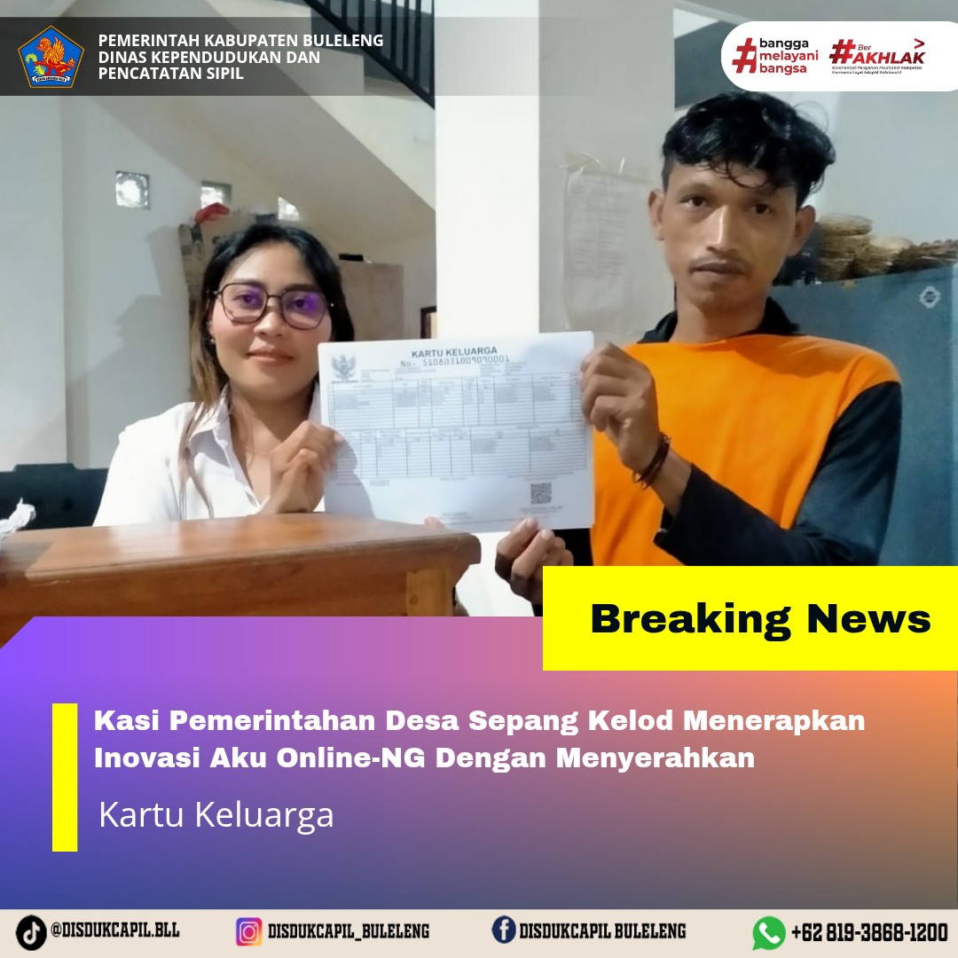 Pemerintah Kabupaten Buleleng melalui Dinas Kependudukan dan Pecatatan Sipil (Disdukcapil) Kabupaten Buleleng memaksimalkan serta mempermudah pelayanan kependudukan masyarakat dengan beberapa inovasi, melalui aplikasi AKU Online. Dimana dalam penerapan aplikasi Aku Online tersebut masyarakat tidak perlu lagi datang ke Dinas Dukcapil untuk melakukan pelayanan langsung cukup dengan datang ke Desa nanti akan dibantu oleh operator Desa masing-masing. Di Desa Sepang Kelod Kecamatan Busungbiu telah diserahkan dokumen kependudukan berupa Kartu Keluarga yang diserahkan oleh Operator Desa Sepang Kelod Kecamatan Busungbiu, Rabu (22/10).