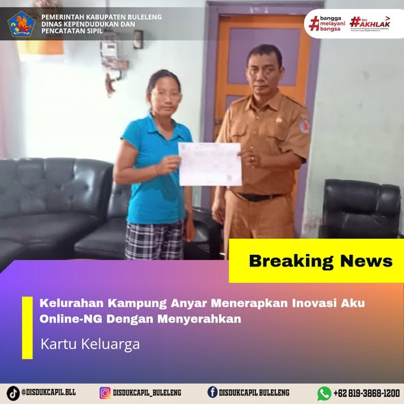 Pemerintah Kabupaten Buleleng melalui Dinas Kependudukan dan Pecatatan Sipil (Disdukcapil) Kabupaten Buleleng memaksimalkan serta mempermudah pelayanan kependudukan masyarakat dengan beberapa inovasi, melalui aplikasi AKU Online-NG. Dimana dalam penerapan aplikasi Aku Online-NG tersebut masyarakat tidak perlu lagi datang ke Dinas Dukcapil untuk melakukan pelayanan langsung cukup dengan datang ke Desa nanti akan dibantu oleh operator Desa masing-masing. Di Kelurahan Kampung Anyar Kecamatan Buleleng, telah diserahkan dokumen kependudukan berupa Kartu Keluarga karena mengganti status pekerjaan atas nama Nengah Agus Wiarsa yang diserahkan langsung oleh Kelurahan Kampung Anyar Kecamatan Buleleng, Kabupaten Buleleng, Senin (22/12).
