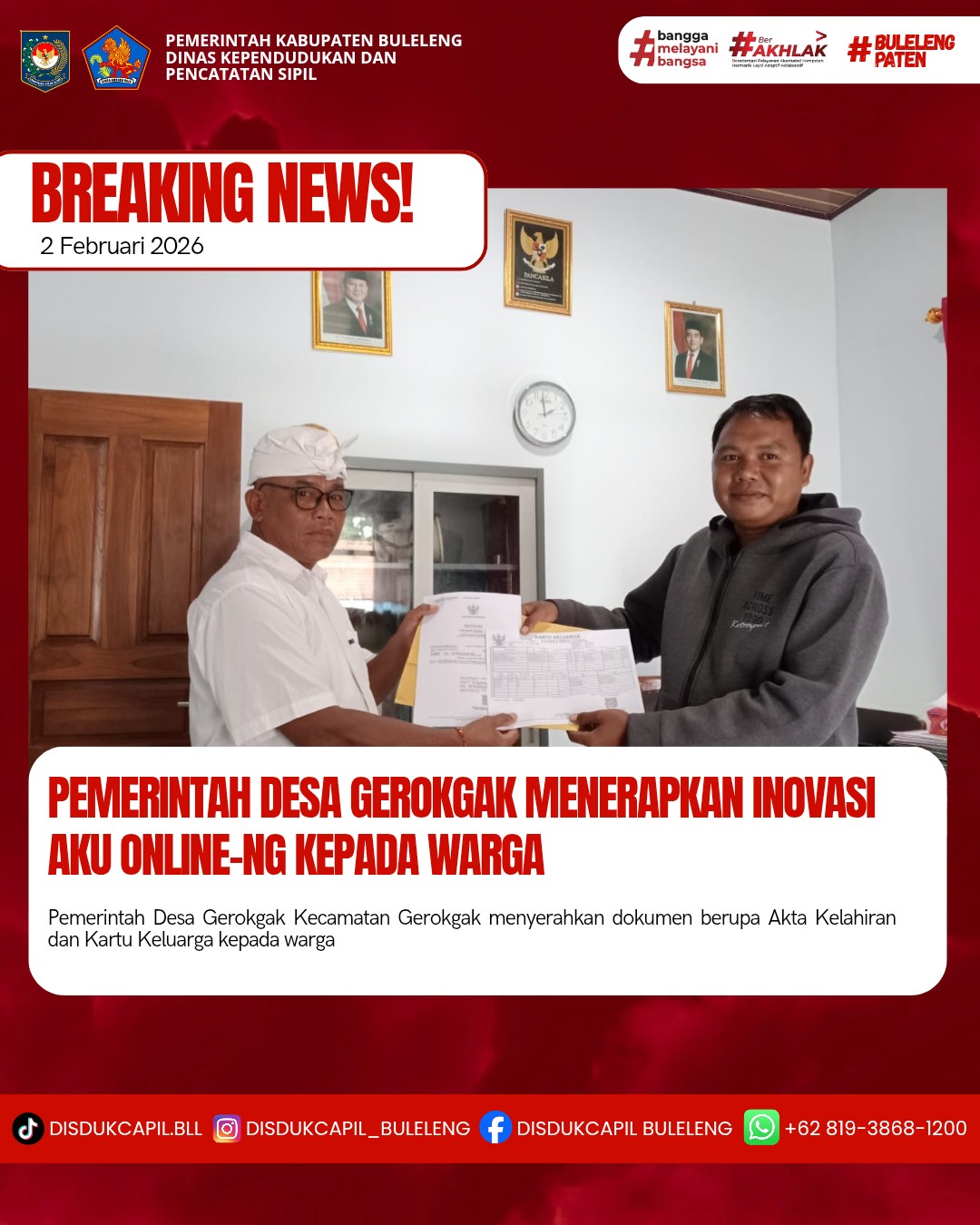Pemerintah Kabupaten Buleleng melalui Dinas Kependudukan dan Pecatatan Sipil (Disdukcapil) Kabupaten Buleleng memaksimalkan serta mempermudah pelayanan kependudukan masyarakat dengan beberapa inovasi, melalui aplikasi AKU Online-NG. Dimana dalam penerapan aplikasi Aku Online-NG tersebut masyarakat tidak perlu lagi datang ke Dinas Dukcapil untuk melakukan pelayanan langsung cukup dengan datang ke Desa nanti akan dibantu oleh operator Desa masing-masing. Di Desa Gerokgak Kecamatan Gerokgak, telah diserahkan dokumen kependudukan berupa Akta Kelahiran atas nama Komang Ayu Anditha Yoshi Putri dan Kartu Keluarga atas nama Putu Suyasmika yang diserahkan langsung oleh Kelian Banjar Dinas Tamansari Desa Gerokgak, Senin (2/2).