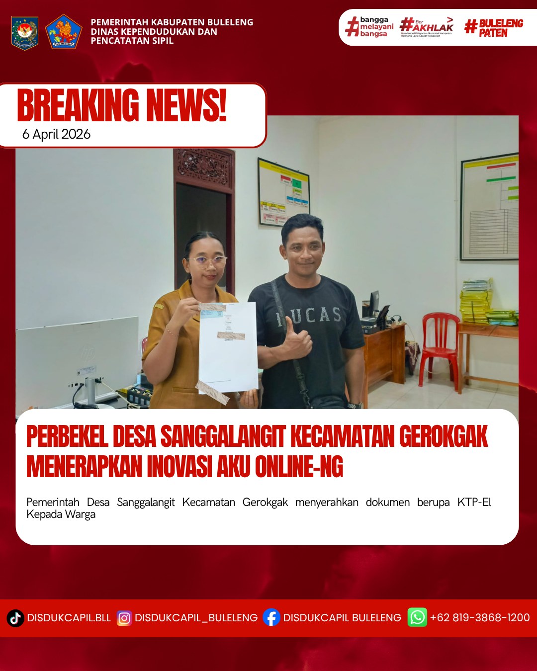 Pemerintah Kabupaten Buleleng melalui Dinas Kependudukan dan Pecatatan Sipil (Disdukcapil) Kabupaten Buleleng memaksimalkan serta mempermudah pelayanan kependudukan masyarakat dengan beberapa inovasi, melalui aplikasi AKU Online-NG. Dimana dalam penerapan aplikasi Aku Online-NG tersebut masyarakat tidak perlu lagi datang ke Dinas Dukcapil untuk melakukan pelayanan langsung, cukup dengan datang ke Desa nanti akan dibantu oleh operator Desa masing-masing. Di Desa Sanggalangit Kecamatan Gerokgak, telah diserahkan dokumen kependudukan berupa KTP-El kepada warga atas nama DAHLANI warga Banjar Dinas Tukadpule Desa Sanggalangit yang diserahkan langsung oleh Operator Aku Online, Desa Sanggalangit , Senin (6/4).