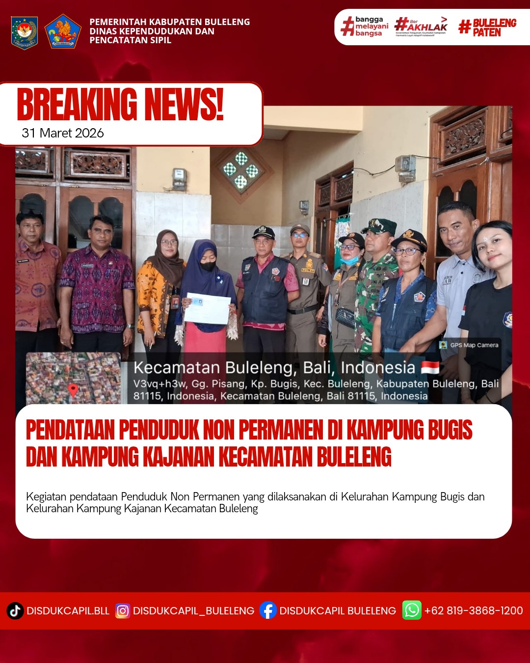 Kali ini Selasa, 31 Maret 2026, Dinas Kependudukan dan Pencatatan Sipil Kabupaten Buleleng melaksanakan kegiatan pendataan penduduk Non Permanen di Kelurahan Kampung Bugis dan Kelurahan Kampung Kajanan Kecamatan Buleleng. Dari pendataan penduduk kali ini diperoleh hasil :